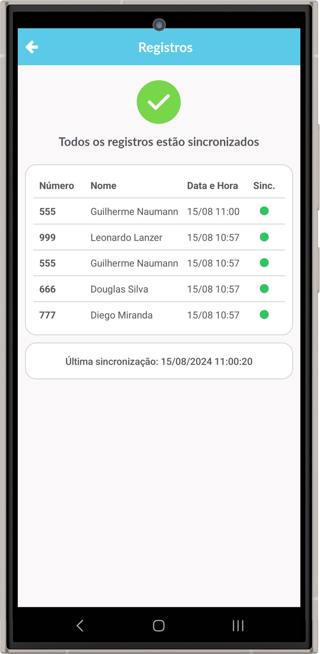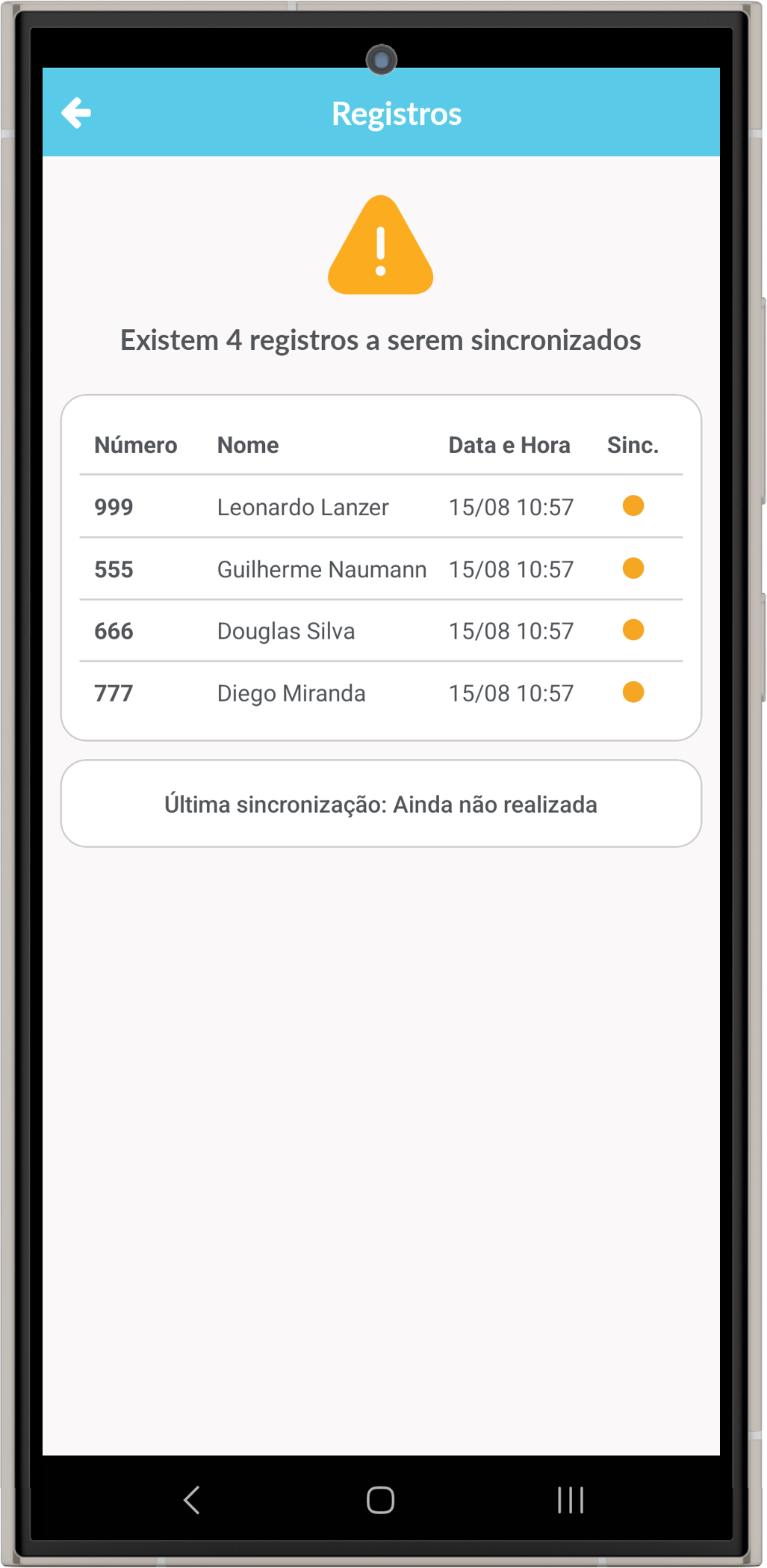 Nas Configurações do aplicativo, ao clicar em Registros, é possível visualizar tanto as marcações pendentes quanto as que já foram sincronizadas. Quando o dispositivo se conecta à internet, uma mensagem de Sincronizando registros aparecerá na tela inicial, indicando que as marcações estão sendo importadas para o sistema de ponto;