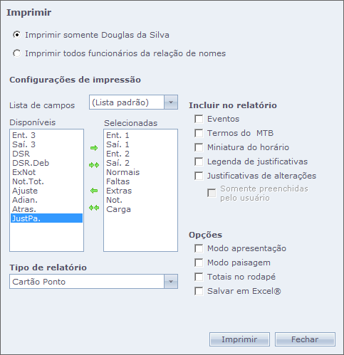 - Miniatura do horário: Impressão do quadro de horário do funcionário no cabeçalho do relatório;
