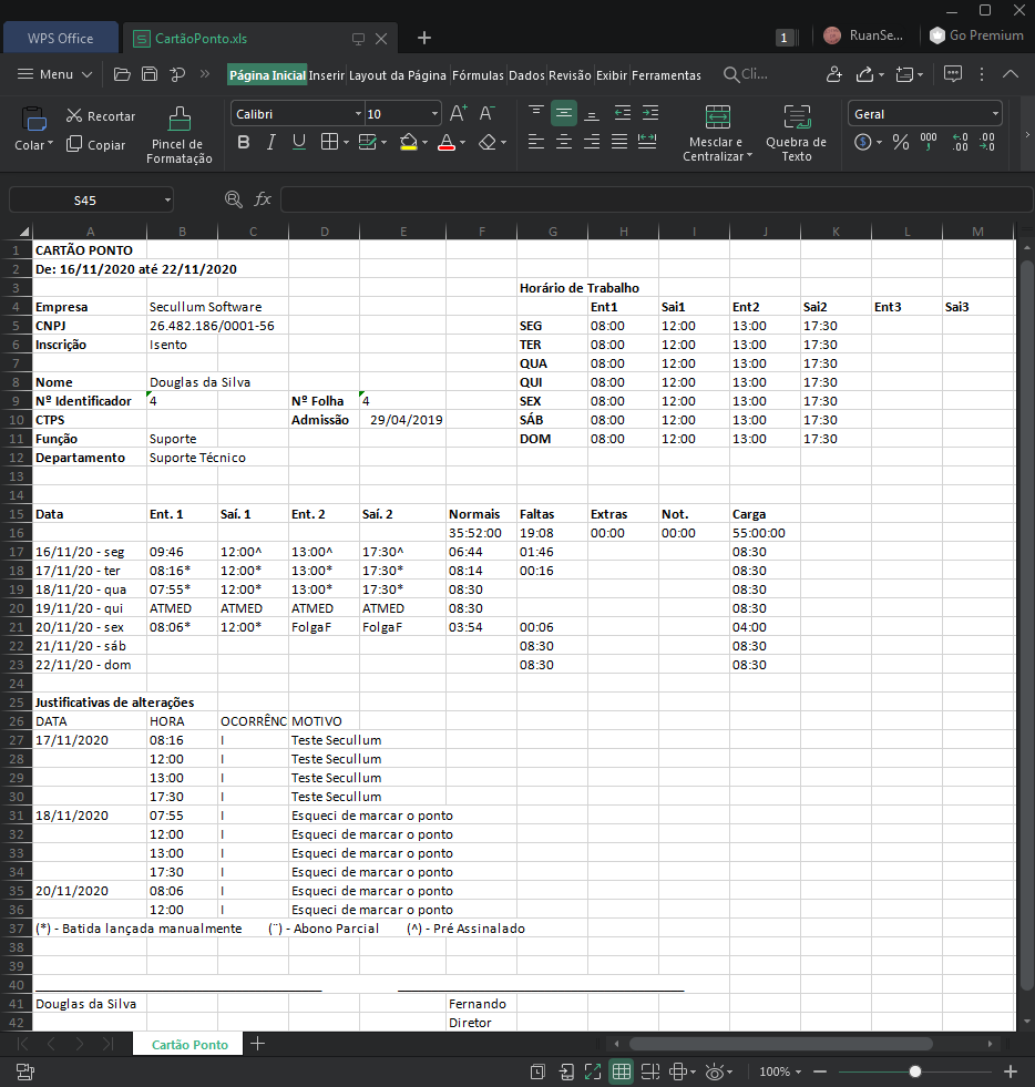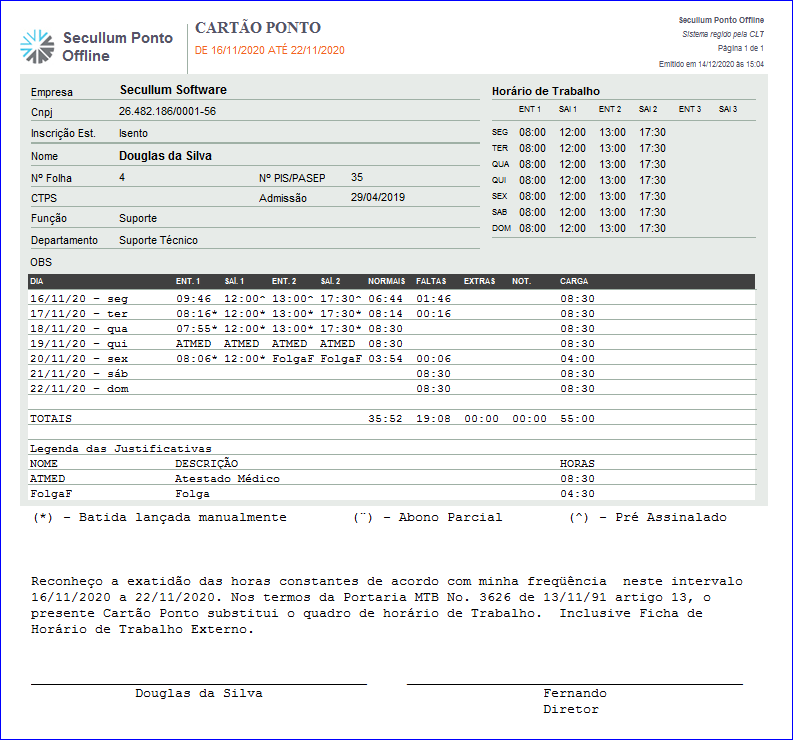 - Legenda de justificativas: Inclui no relatório a legenda das justificativas lançadas para o funcionário no período selecionado. Contendo o nome da justificativa, a descrição e quantidade em horas;