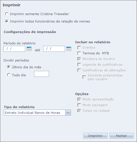 - Termos da MTB: Impressão dos Termos do Ministério do Trabalho no rodapé do relatório;