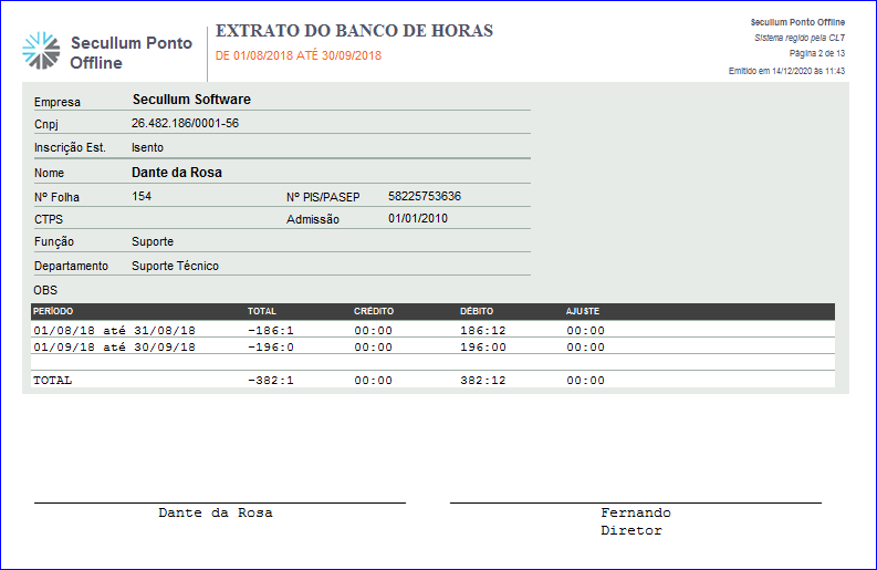 Esse relatório é bastante utilizado para visualizar o saldo atual do funcionários, bem como os Créditos e Débitos do Banco de Horas.