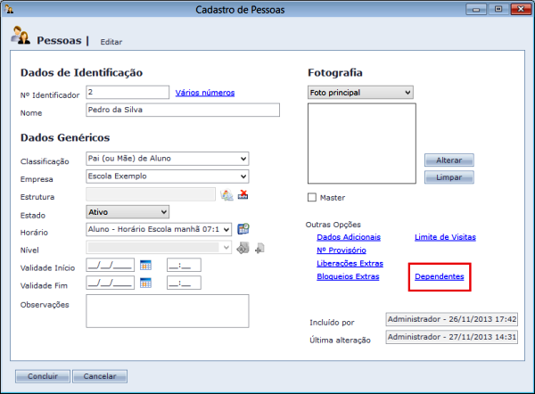 Em nosso exemplo, efetuamos o cadastro de Pedro da Silva (pai) e João da Silva (aluno);