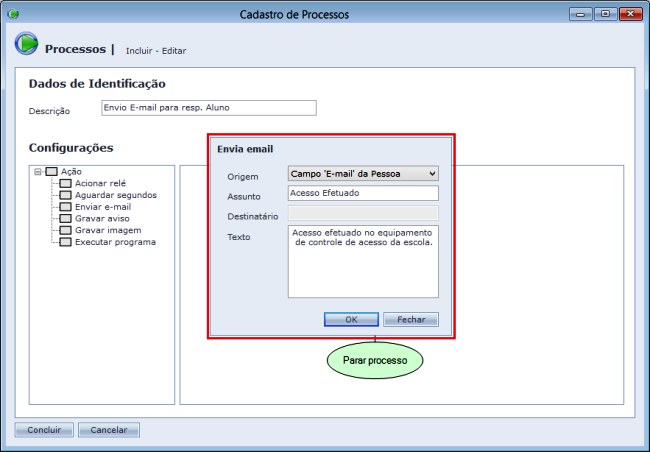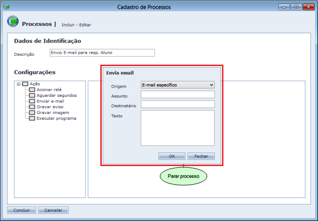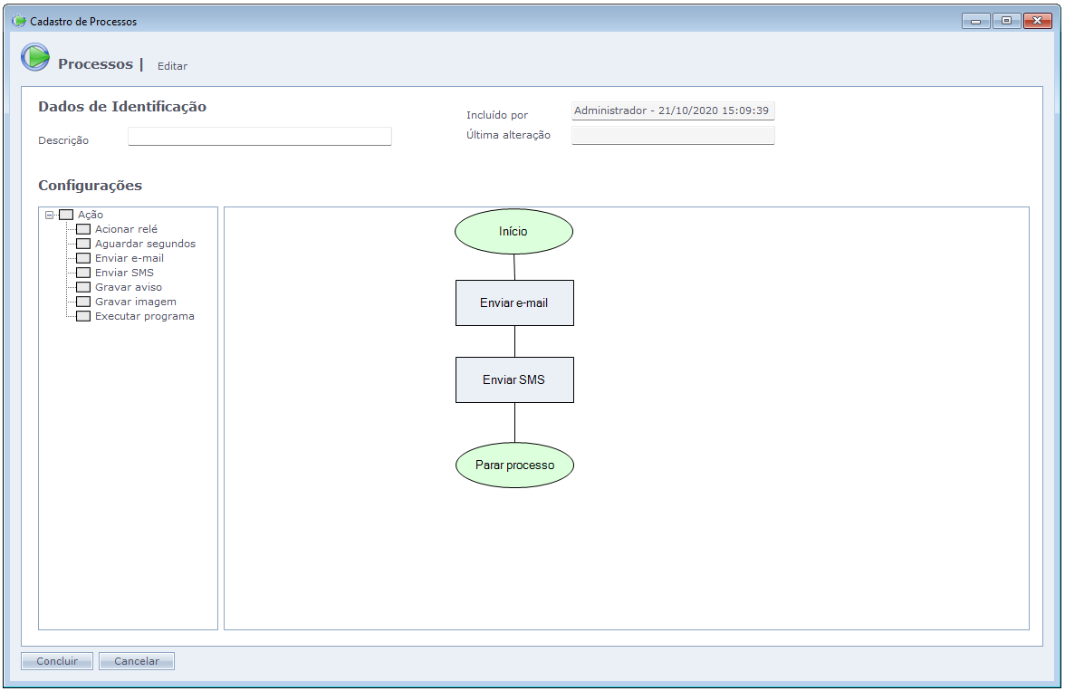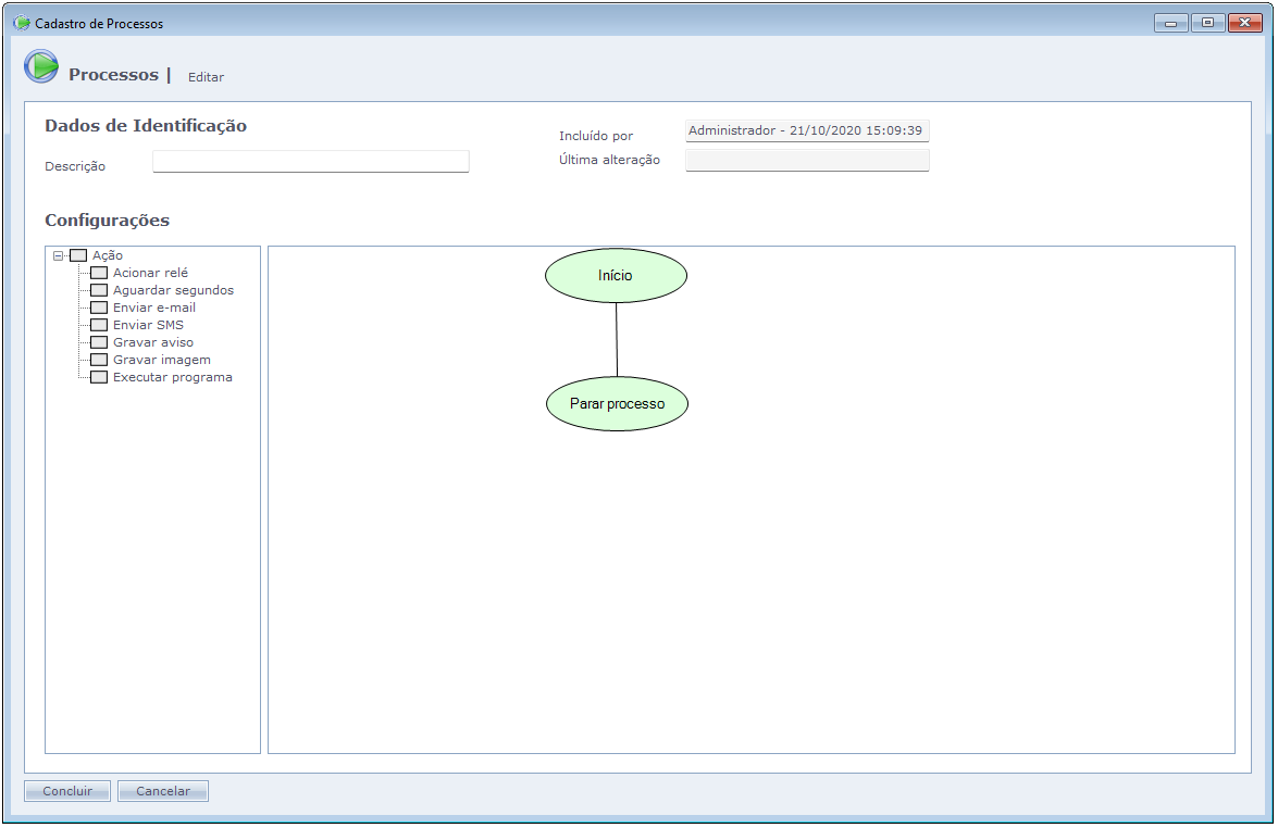 É nesta tela que podemos Incluir, Alterar ou Excluir processos no software. É nos processos que configuramos as ações que serão efetuadas neste: Acionar relé, Enviar e-mail, Enviar SMS entre outros.