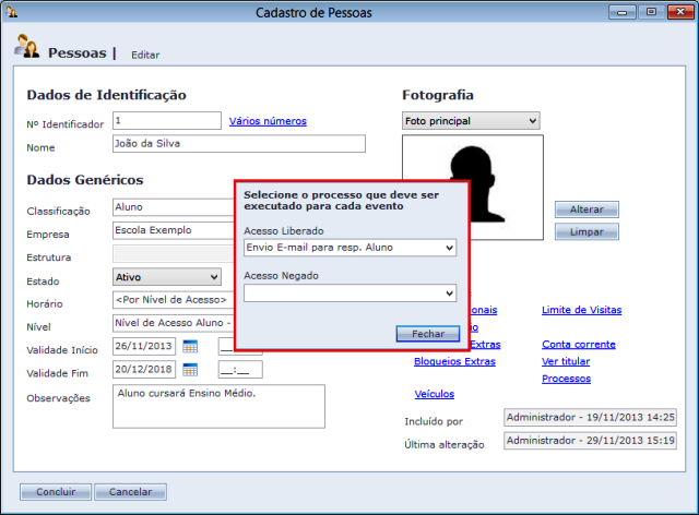 No cadastro do aluno João, clique no botão Concluir, em seguida, na tela de cadastro de Pessoas, clique no botão Fechar.