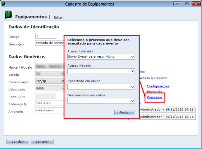 Há a possibilidade de utilizar outros processos para os demais eventos ali apresentados: Acesso Negado, Conectados em online e Desconectado em online. Para o exemplo que estamos demonstrando, utilizaremos somente o primeiro evento: Acesso Liberado.
