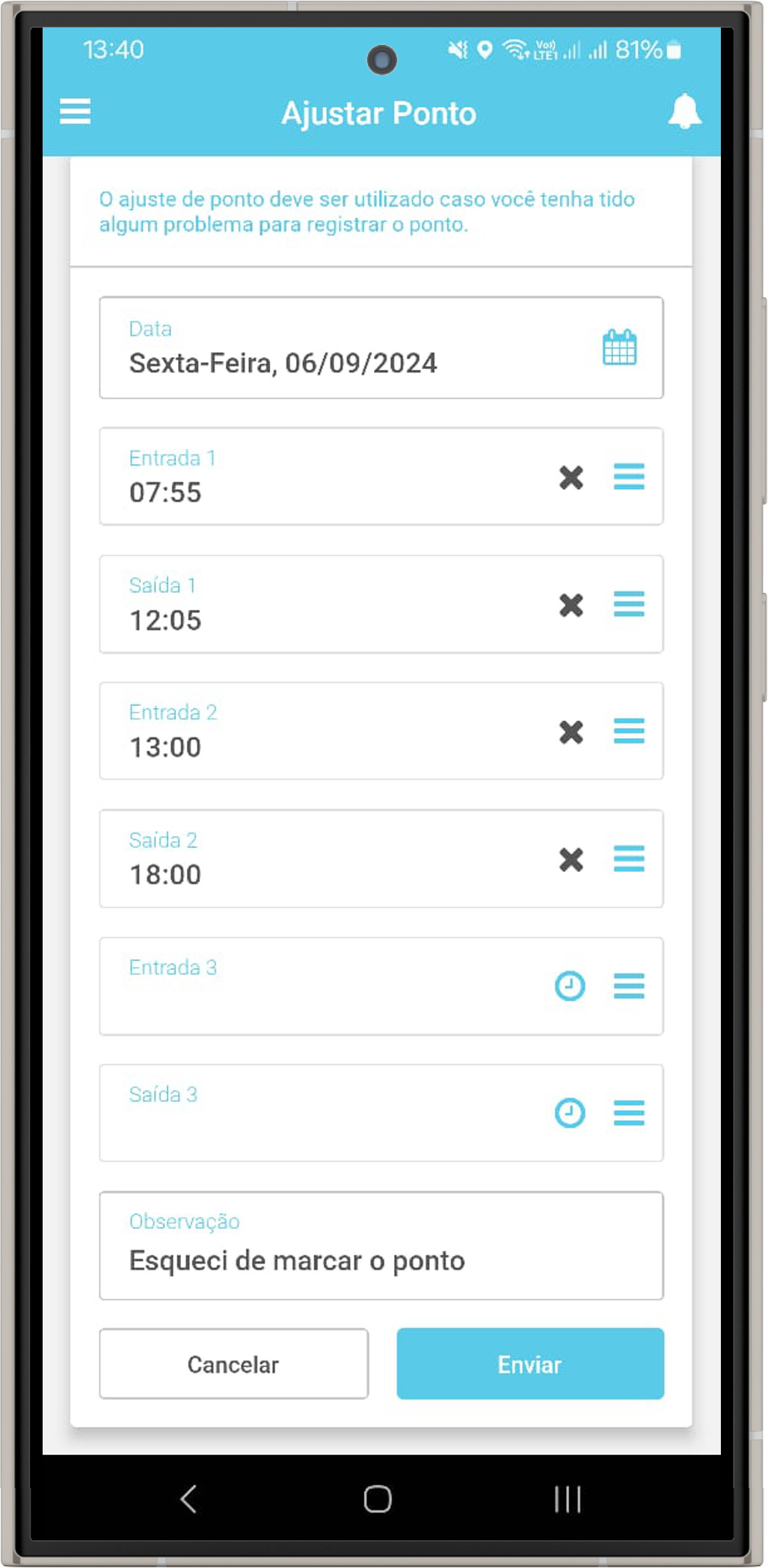 • Notificar em caso de esquecimento: O funcionário receberá uma notificação se não registrar o ponto dentro de 5 minutos do horário previsto.