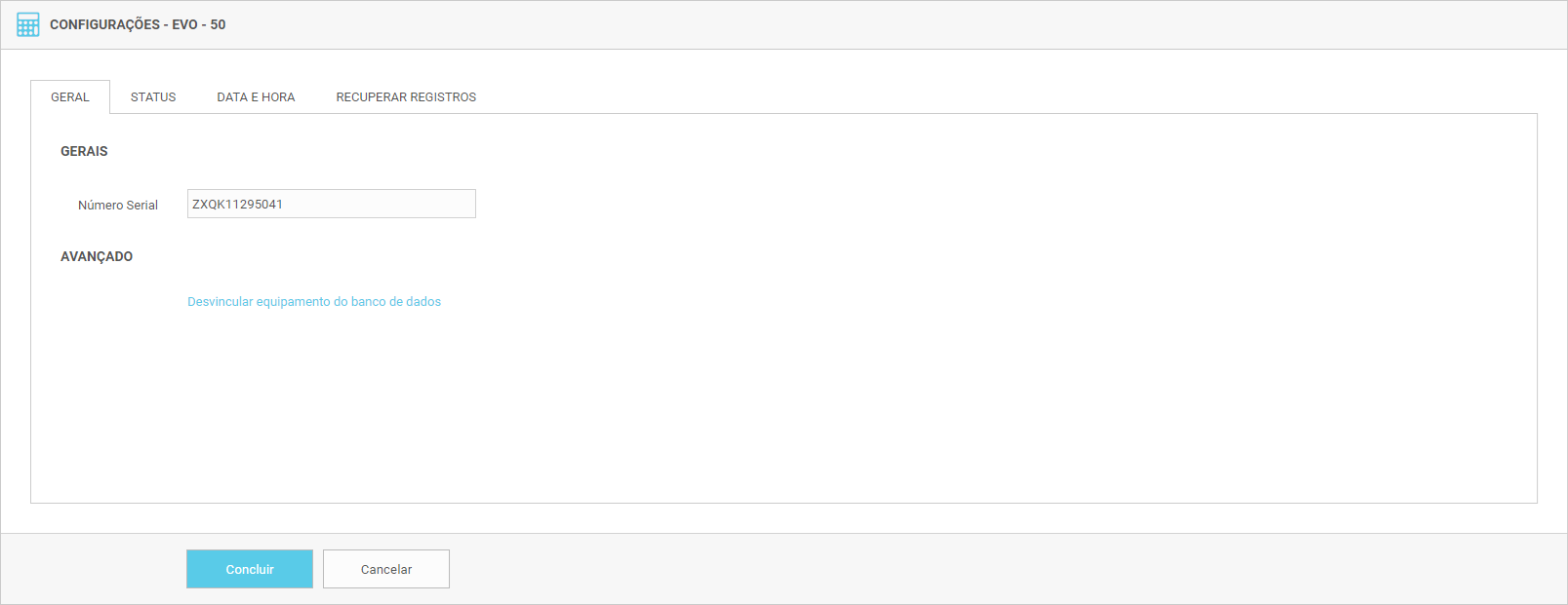 - GERAL: Preencha o campo Número Serial do equipamento. Certifique-se de inserir o número corretamente, pois esse número é essencial para a comunicação com o equipamento;