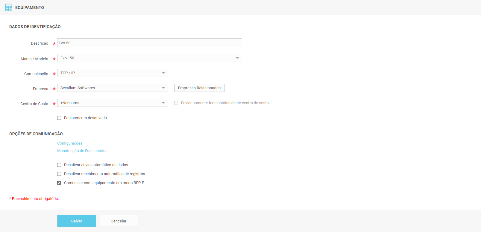 | Configurações do equipamento Evo no Secullum Ponto Web |