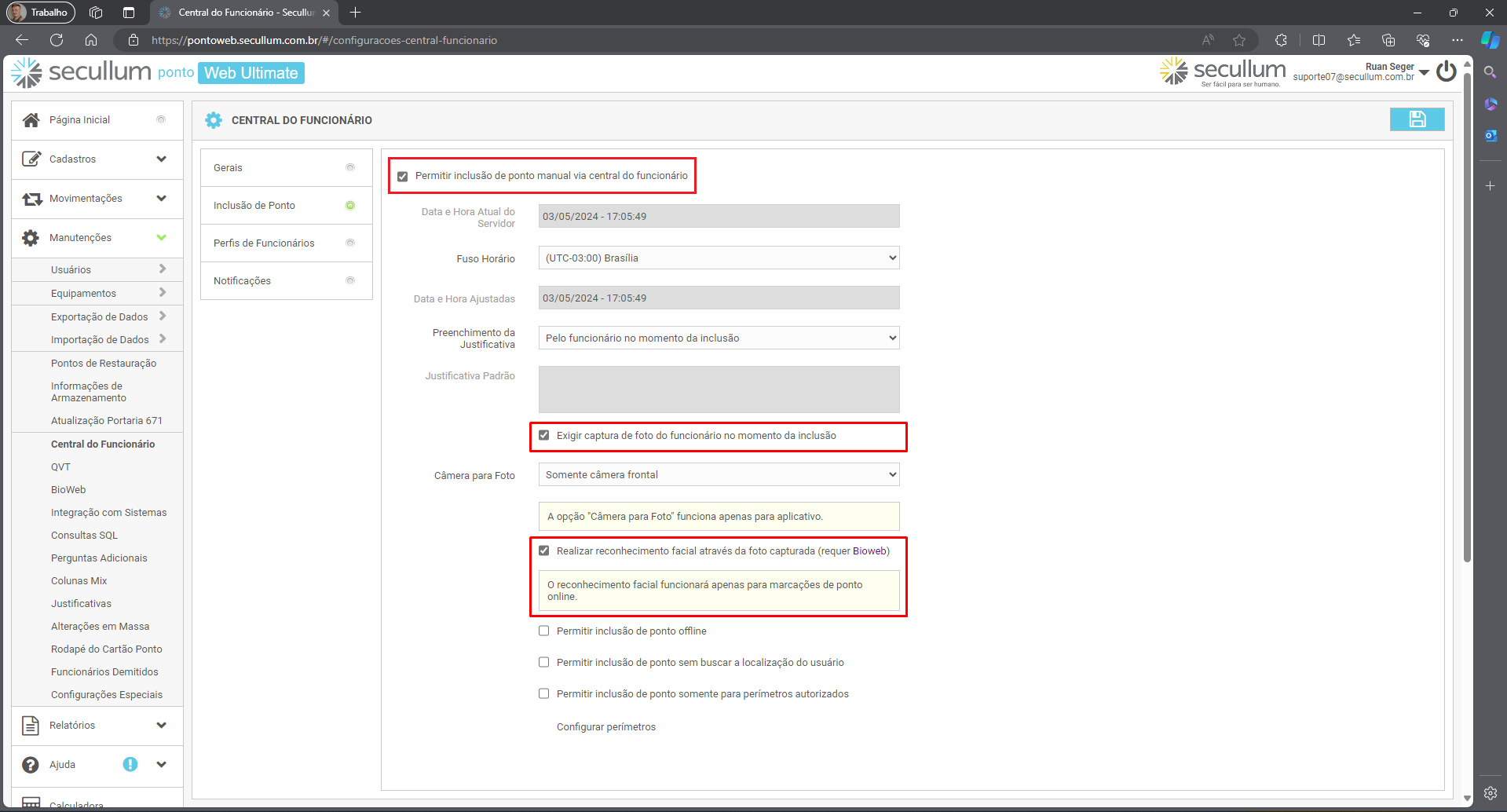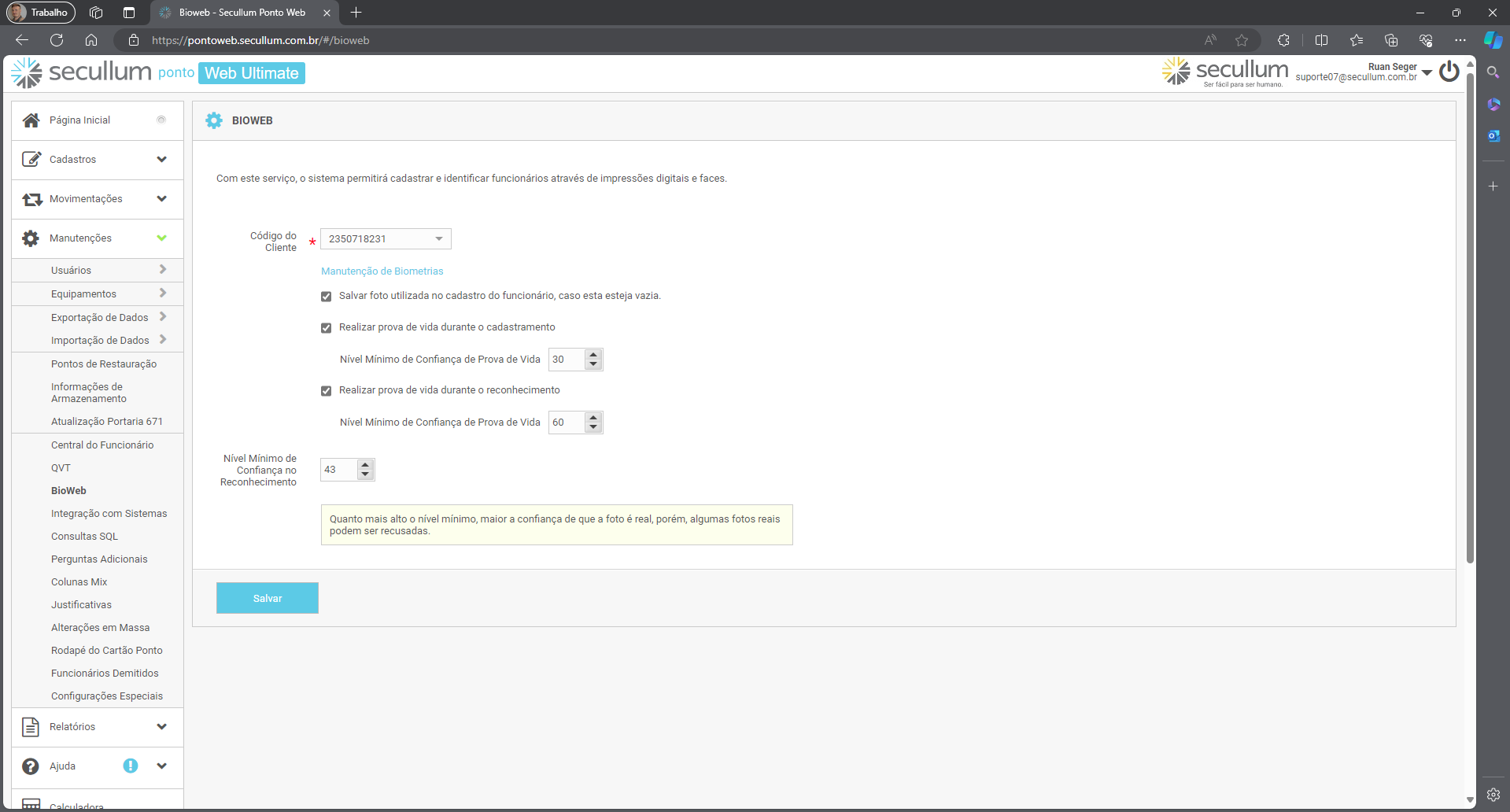 Depois da ativação pela Área da Revenda, no Secullum Ponto Web, acesse o menu Manutenções - BioWeb para a configuração do Reconhecimento Facial Online.