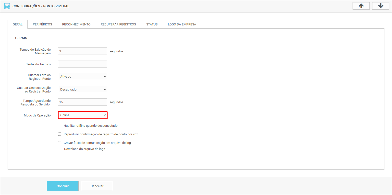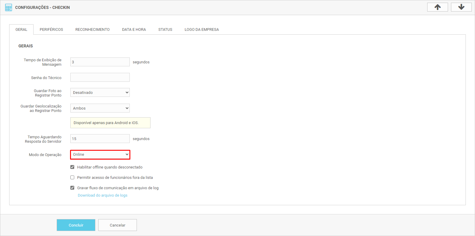 No sistema Secullum Ponto Web, também devemos configurar no equipamento, o Modo de Operação — Online.