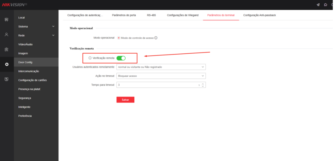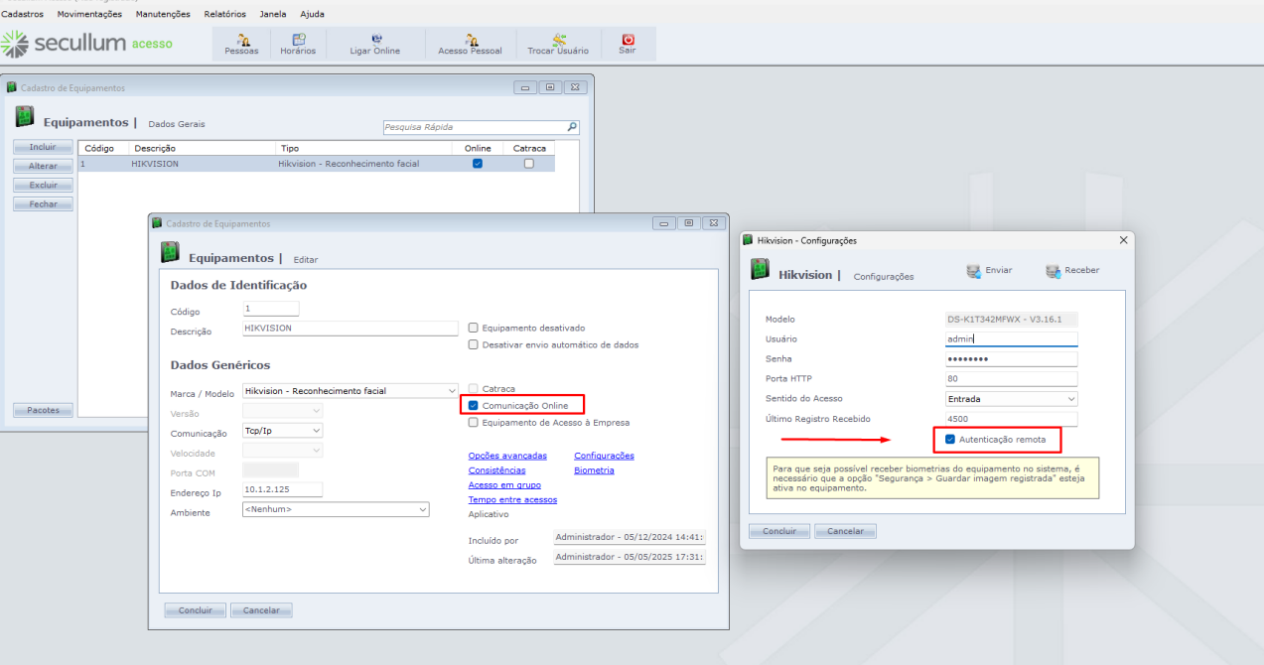 Ao habilitar a opção Autenticação Remota no sistema e enviar as configurações para o equipamento,