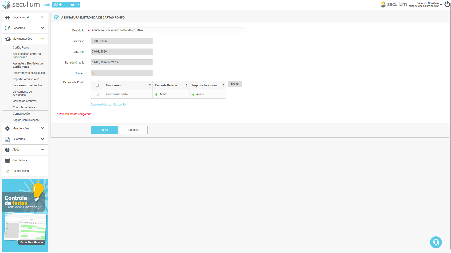 Após marcar esta opção, os novos lançamentos de Assinatura Eletrônica de Cartão Ponto irão ser encaminhados ao Gerente antes do Funcionário.