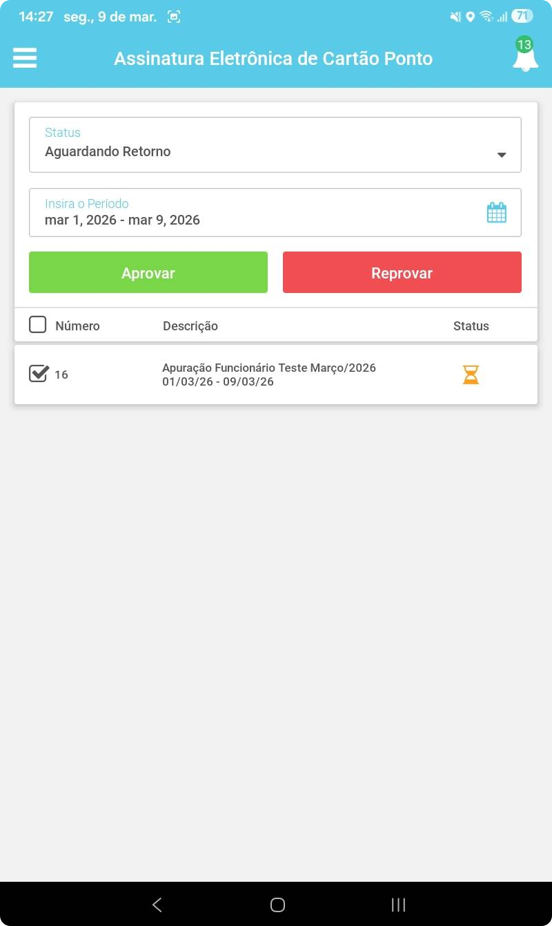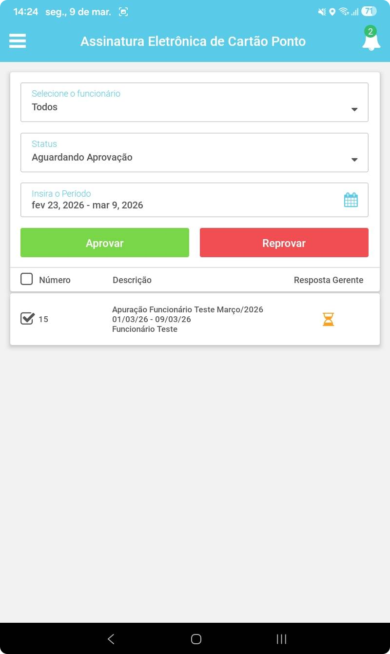 Essa função está disponível no app Central do Funcionário, onde o Cartão Ponto passa por aprovação do Gerente antes de ser encaminhada para o funcionário.