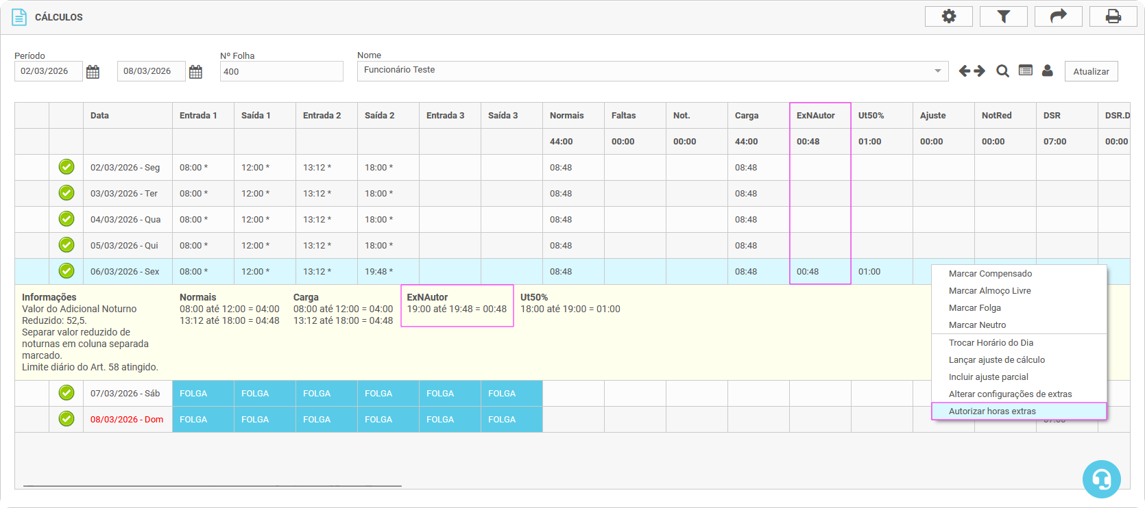 Clicando com o botão direito do mouse em cima do dia na tela de Cálculos, também é possível autorizar essas Extras, juntando todo o valor na respectiva coluna de Extras.