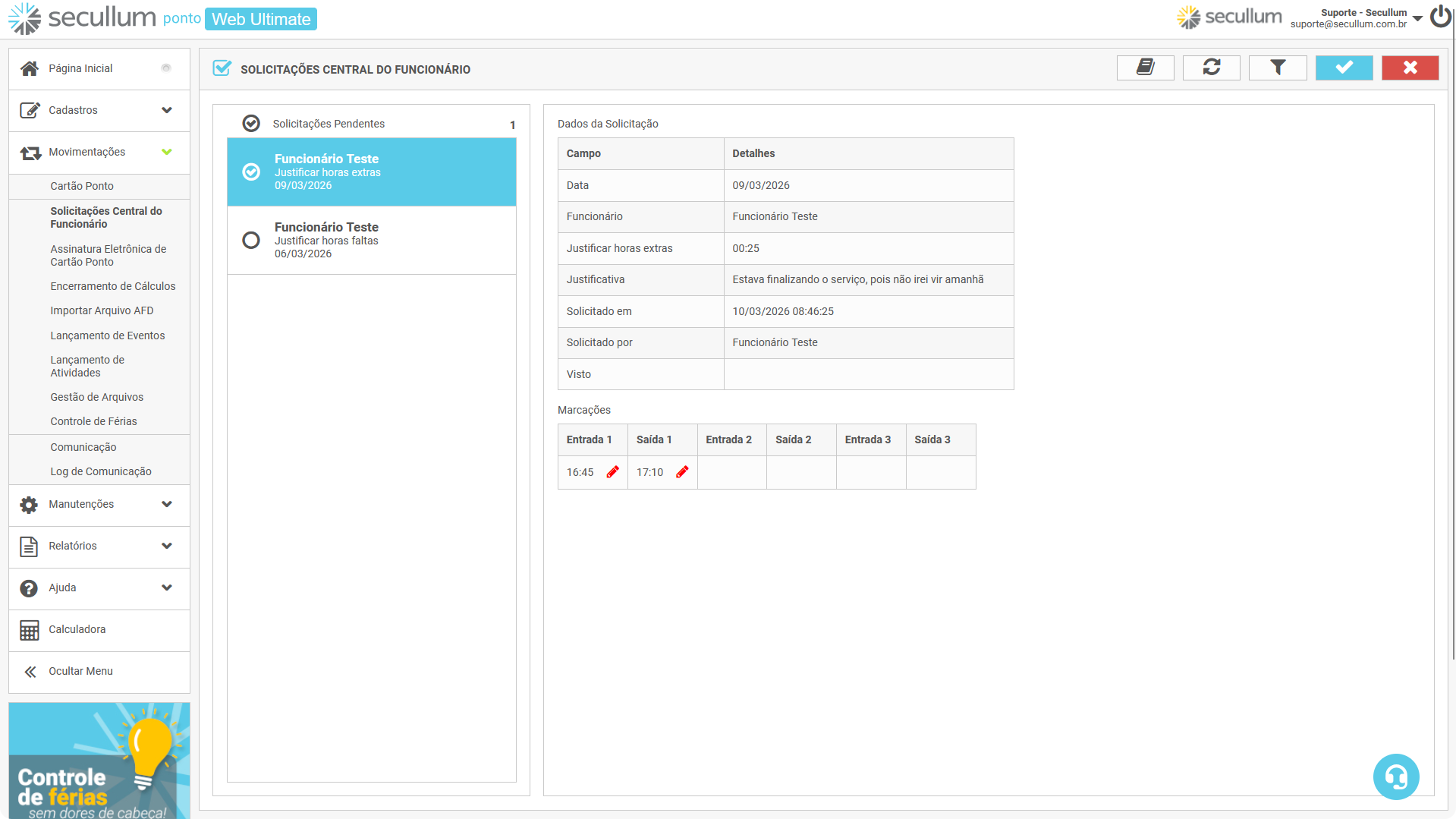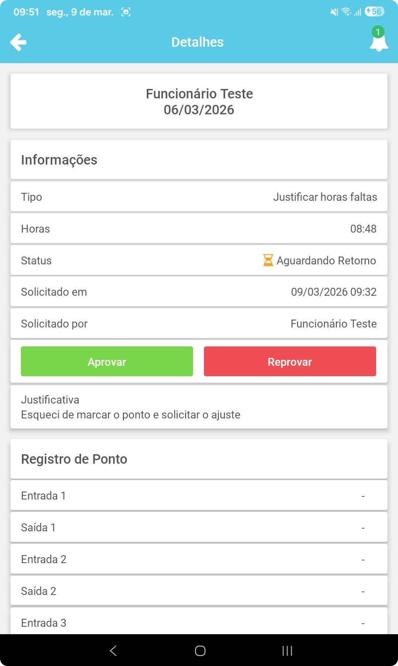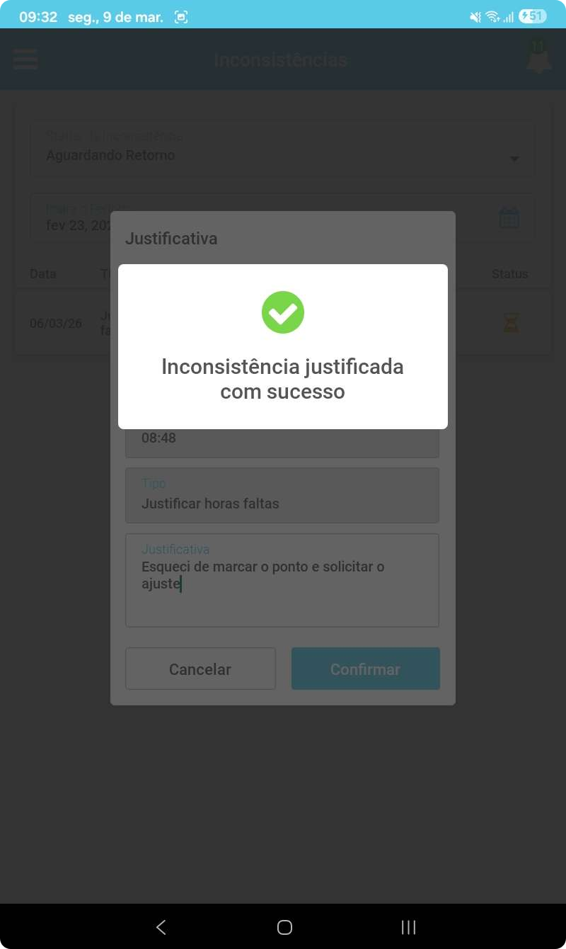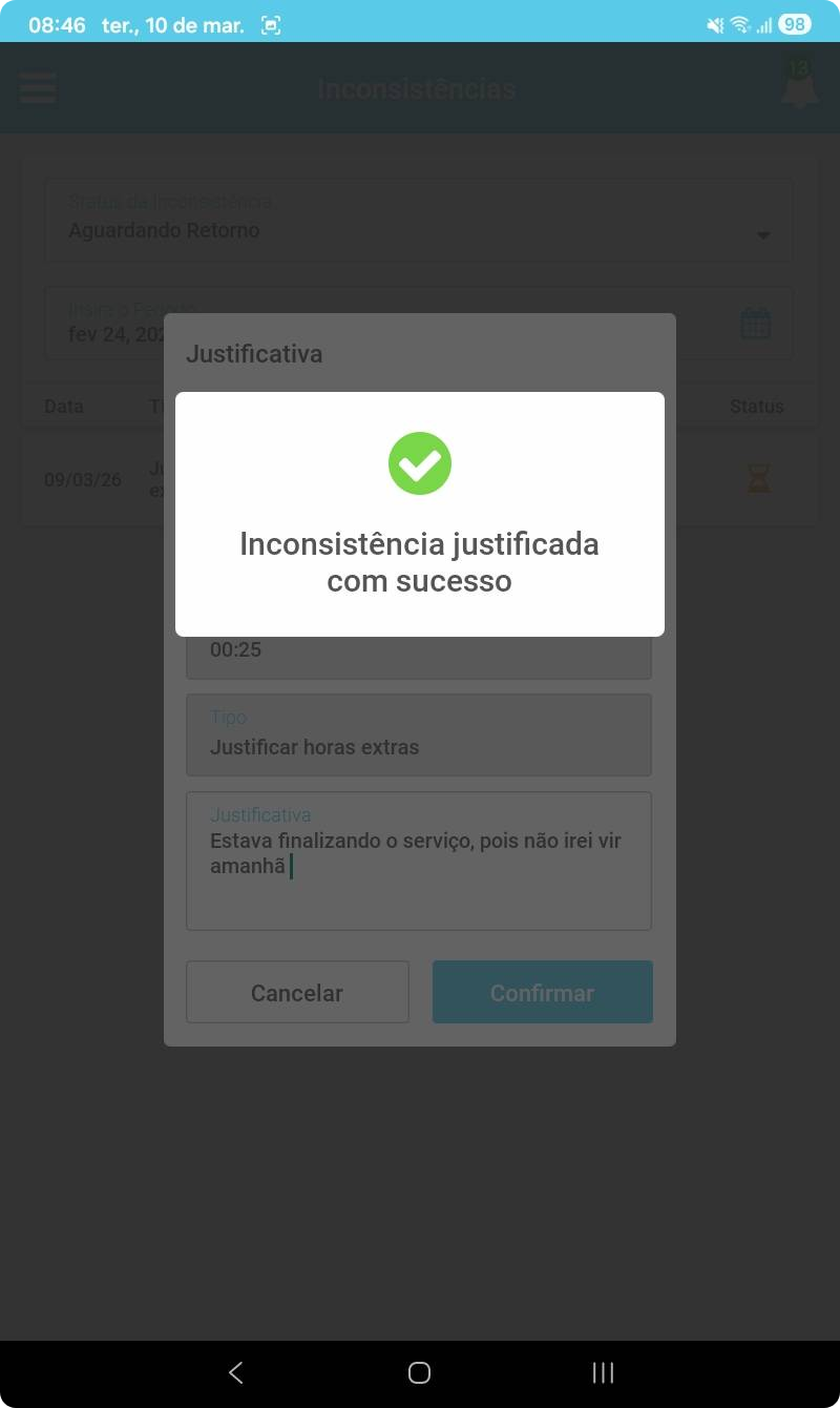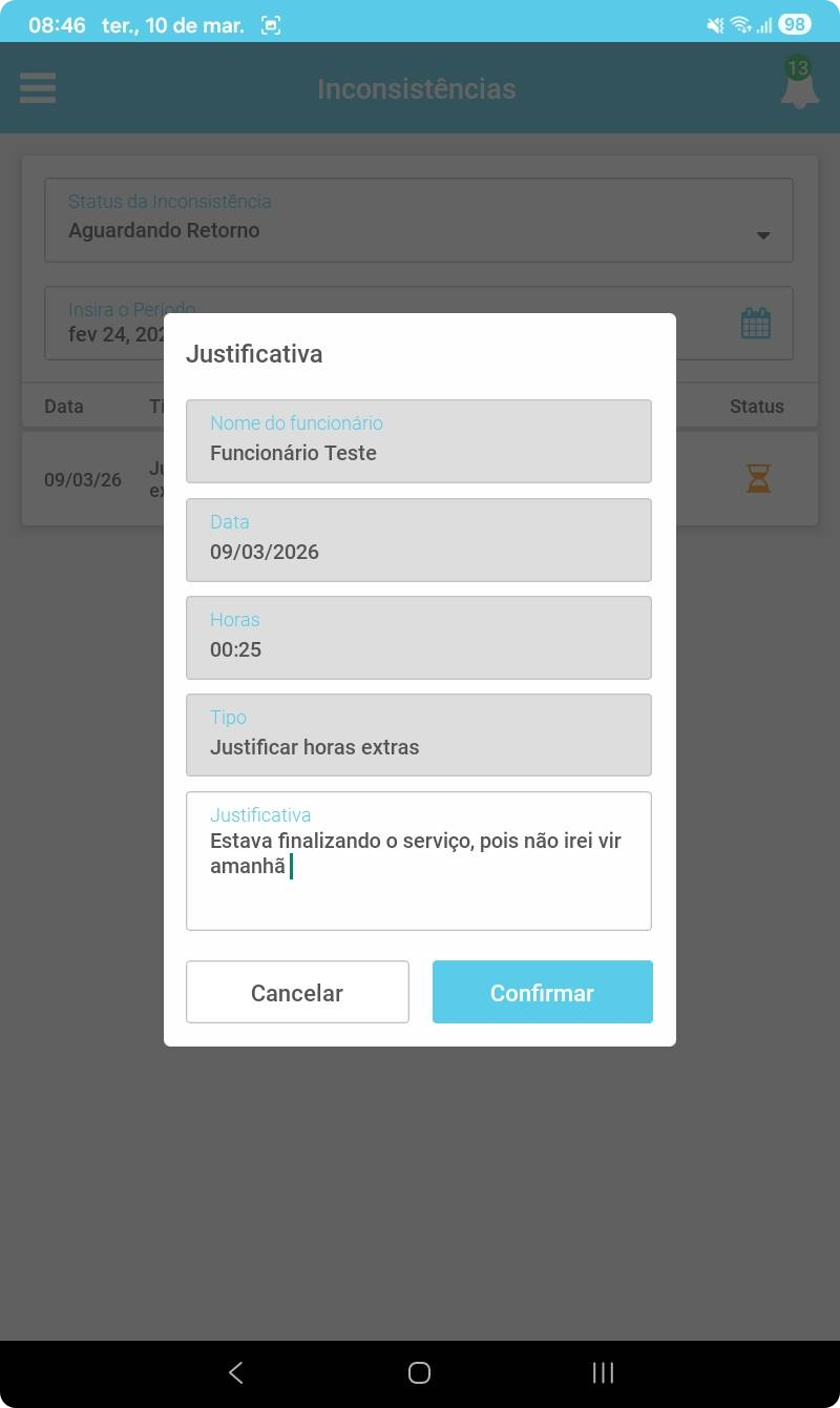 Ao justificar essa inconsistência, a solicitação será encaminhada para aprovação ou rejeição do Gerente responsável ou RH.
