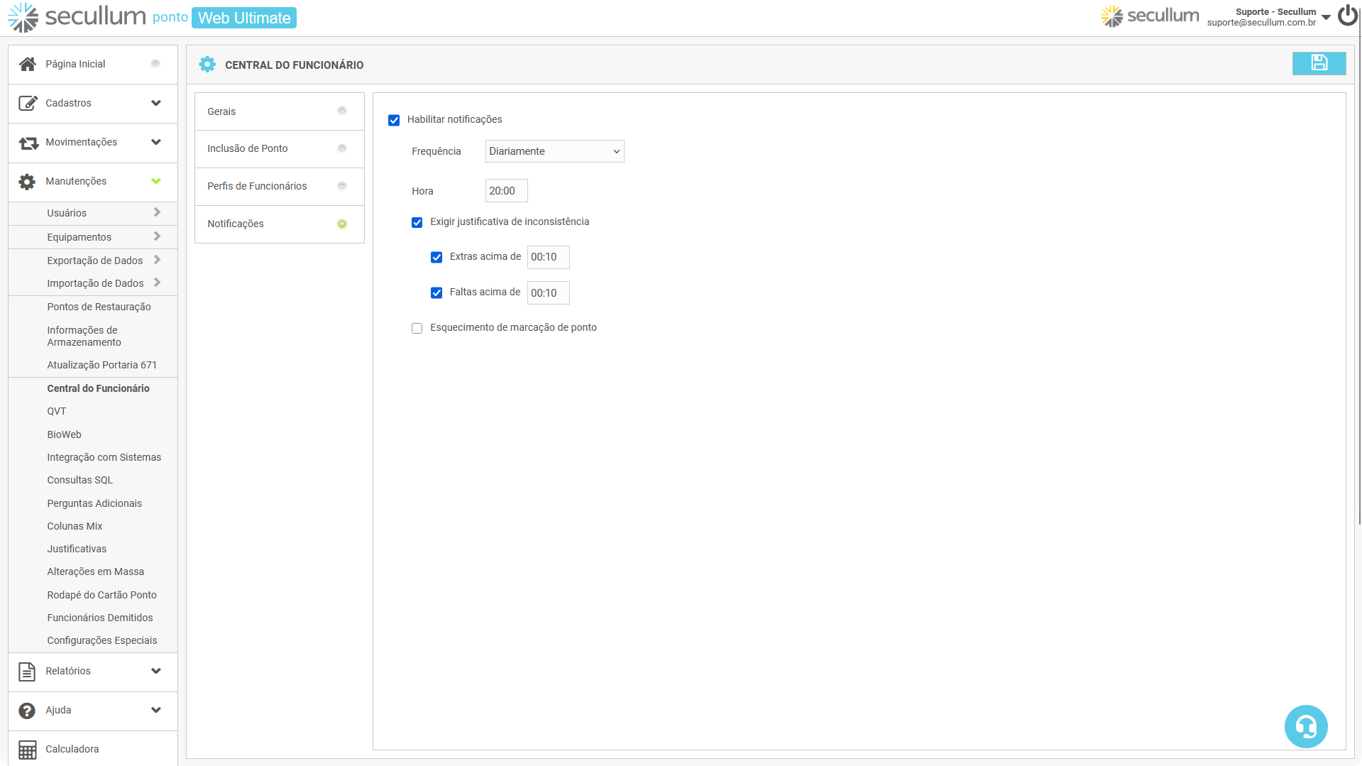 Dentro do Ponto Web, devemos ir até Manutenções > Central do Funcionário > Notificações, marcar a opção de "Habilitar Notificações" e também a opção "Exigir justificativa de inconsistência".