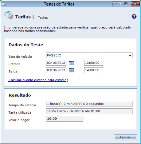 Através desta opção será possível simular um período de permanência do veículo no estacionamento e demonstrar o valor total de pagamento. Fazemos uma "prova real", em que será possível confirmar se a lógica da tarifa cadastrada está correta ou não. Estando a tarifa incorreta, poderá ser alterada e novamente testada, até que esteja ok para uso.