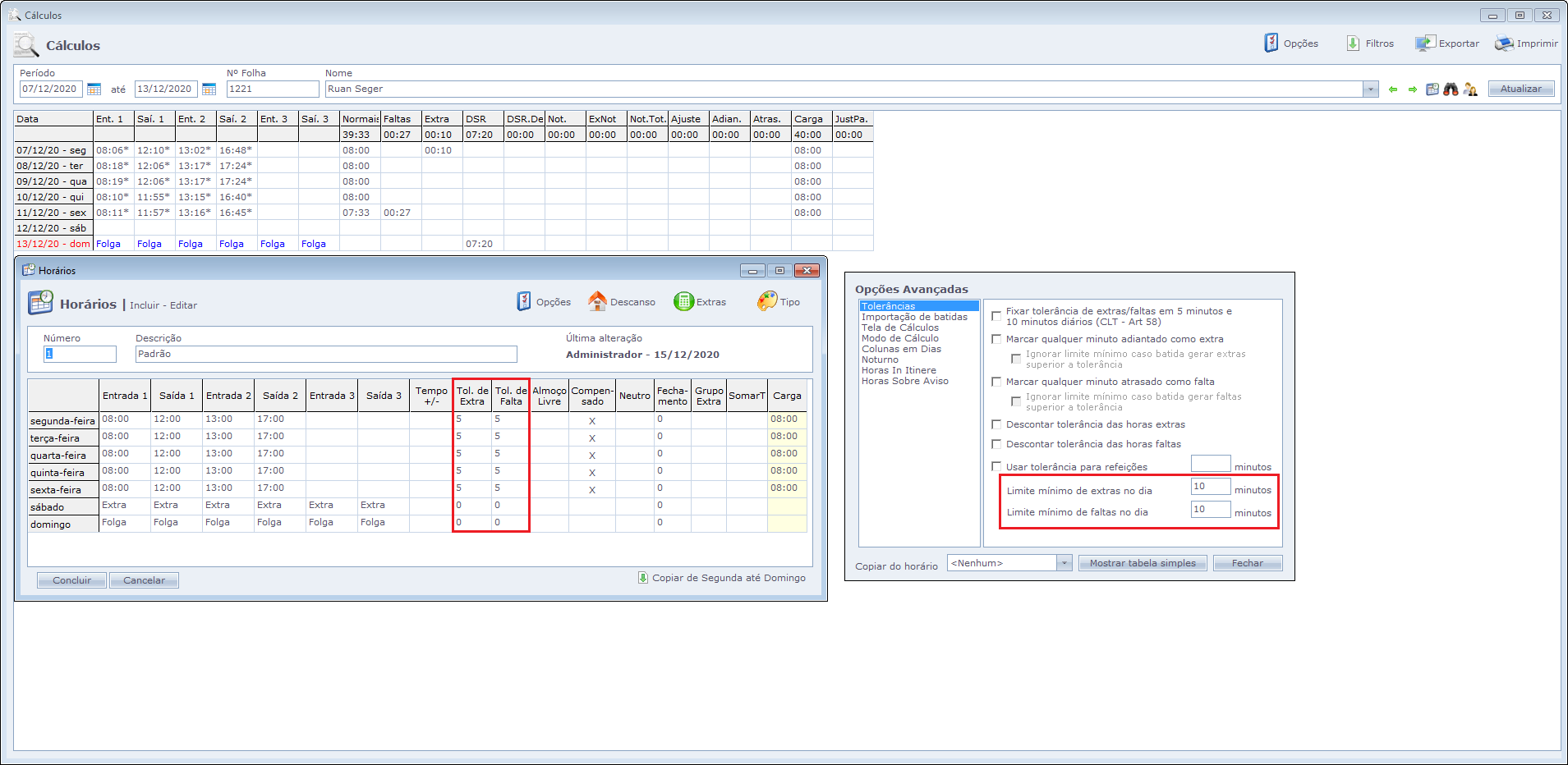 Utilizando somente compensado e com as tolerâncias todas zeradas, o sistema irá considerar somente as tolerâncias específicas para os cálculos, fazendo a compensação entre Faltas e Extras diariamente: