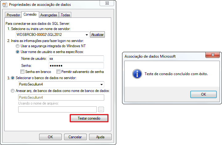 Após as configurações acima, clique então em Testar conexão, se aparecer a mensagem de Teste de conexão concluído com êxito, significa que possivelmente o problema pode estar ligado ao sistema Secullum, porém, se aparecer alguma outra mensagem, o problema provavelmente está no serviço do SQL Server ou no computador em si.