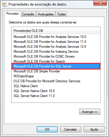 2. Execute o arquivo criado e na aba Provedor, selecione a opção Microsoft OLE DB Provider for SQL Server;