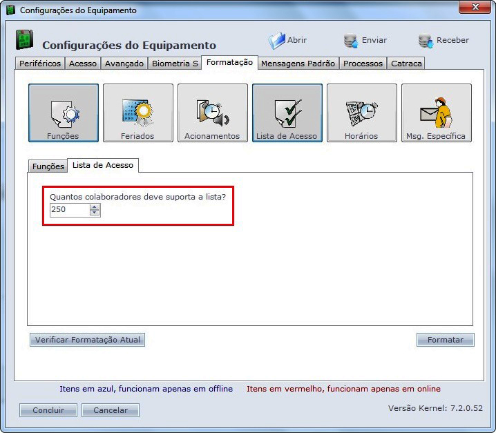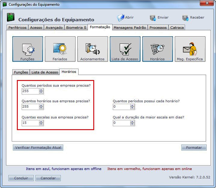 • Segundo informações da Henry, a memória do equipamento suporta no máximo 255 períodos. Ou seja, se formatarmos com 255 períodos conseguimos fazer o restante da formatação que demos no exemplo.