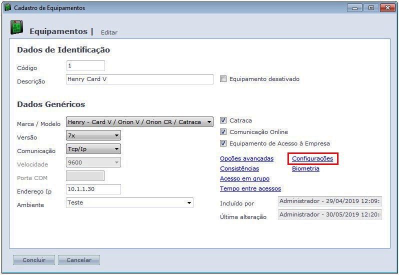 4. Dê duplo clique no equipamento configurado e em seguida entre em Configurações;