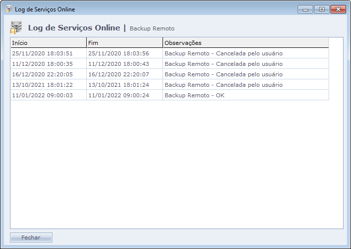 Mostra o histórico de uso da opção, informando o dia início, dia fim e hora em que o administrador tentou importar um backup para a nuvem.