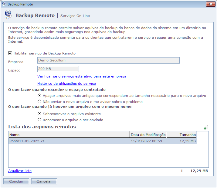 Para banco de dados que possuam mais de um CNPJ cadastrado, o espaço disponível para o Backup Remoto será referente a empresa principal registrada no sistema.