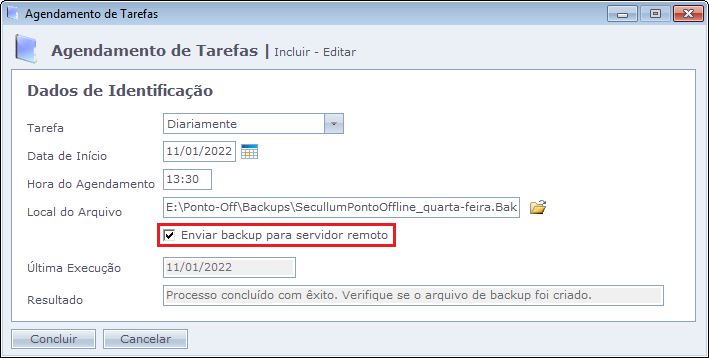 • Enviar backup para servidor remoto: Marque essa opção para que esse backup salvo seja enviado para a nuvem;