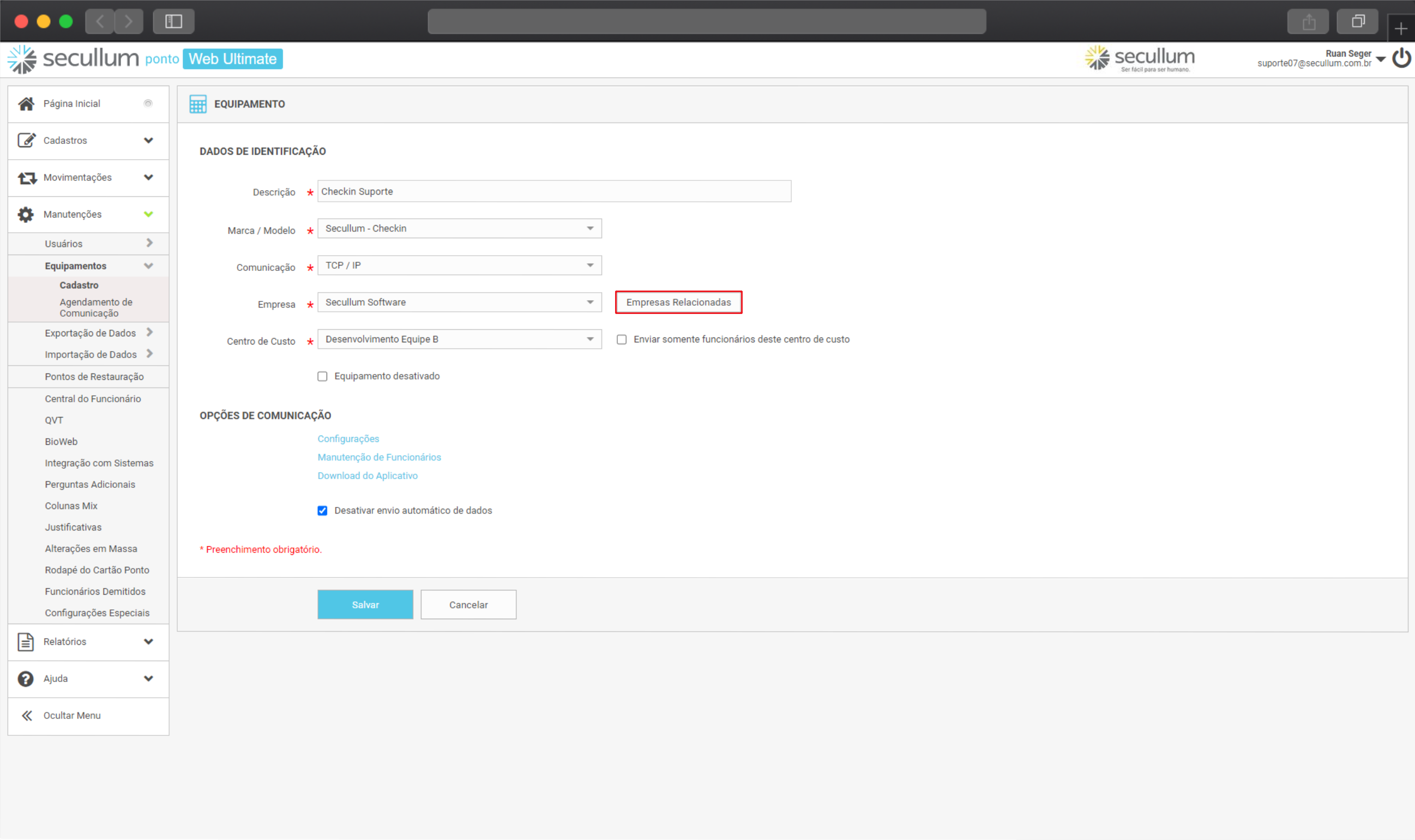 Para essa configuração, devemos ter duas ou mais empresas cadastradas no sistema e em seguida ir no caminho: Manutenções - Equipamentos - Cadastro, selecione o relógio e nessa tela veremos a opção Empresas Relacionadas: