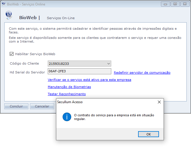 - Para Reconhecimento Online, é necessário a contratação do BioWeb;