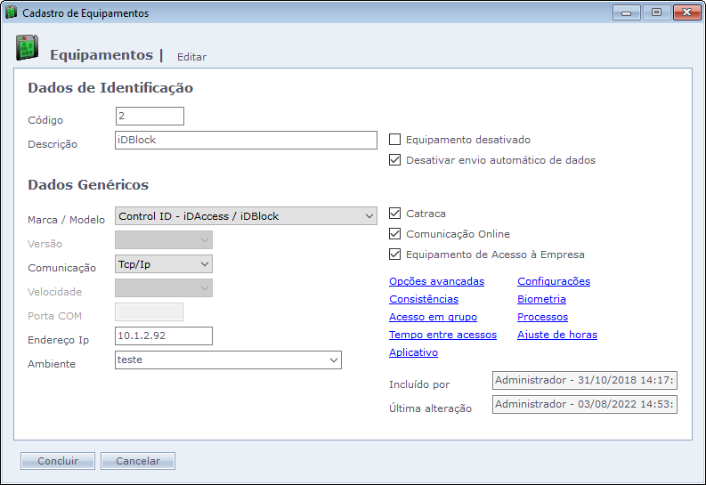 - Configure uma catraca, fechadura ou cancela, no sistema de acesso. Lembrando que esse equipamento deverá ter comunicação Online com os sistemas da Secullum. Nesse exemplo, usaremos uma catraca iDBlock da Control iD;