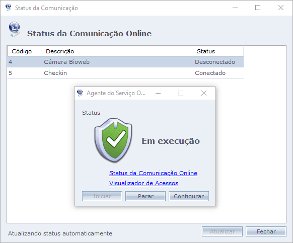 Após salvar as configurações, para finalizarmos a conexão entre Checkin e sistema de acesso, devemos conectar o Agente de Serviço Online desse sistema. Com o agente Em Execução, clique em Status da Comunicação Online e verifique se o Status do equipamento Checkin está como Conectado - se Conectado, a comunicação foi realizada com sucesso, se Desconectado, revise as configurações anteriores.