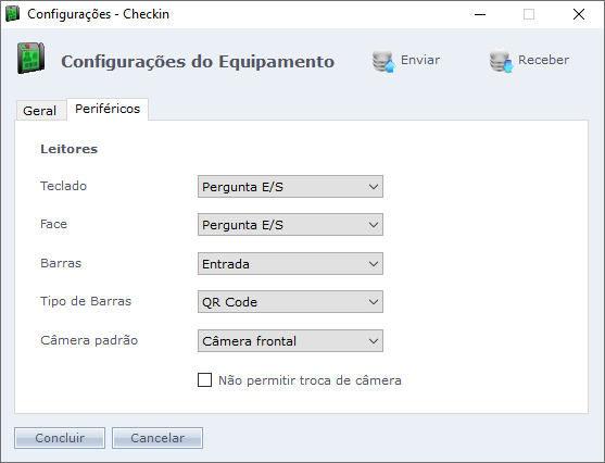 - Barras: Leitor para habilitar o tipo de barras no Checkin. Nesse leitor, podemos escolher entre: Entrada, Saída, Pergunta E/S (ao realizar o acesso, a pessoa irá selecionar se é uma Entrada ou Saída) e Desativado. Lembrando que, se escolhermos apenas Entrada ou somente Saída, esse leitor só realizará esse tipo de acesso;