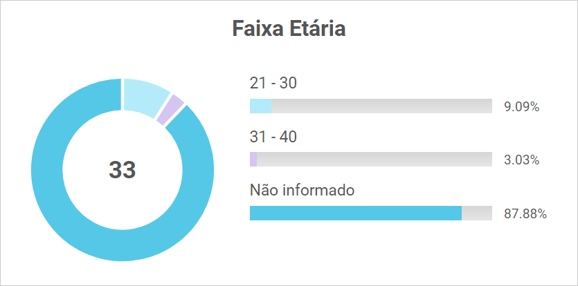 As porcentagens de cada faixa dependerão sempre do filtro realizado entre Empresa e Departamento e também pelo Total de Funcionários que é demonstrado dentro do gráfico de pizza (círculo). Lembrando que clicando no gráfico em pizza, é possível visualizarmos a quantidade de cada faixa etária e ao lado, a porcentagem dela.