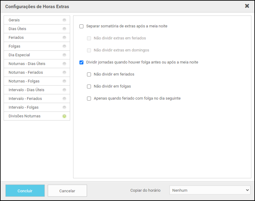Bom, para dividir as jornadas após a meia noite, devemos dentro do horário dos funcionários e ir em Extras - Divisões Noturnas e marcar as opções: Separar somatória de extras após a meia noite e Dividir jornadas quando houver folga antes ou após a meia noite.
