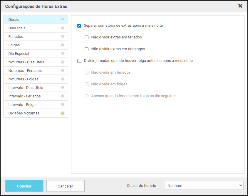 Bom, para dividir as jornadas após a meia noite, devemos dentro do horário dos funcionários e ir em Extras - Divisões Noturnas e marcar a opção: Separar somatória de extras após a meia noite.