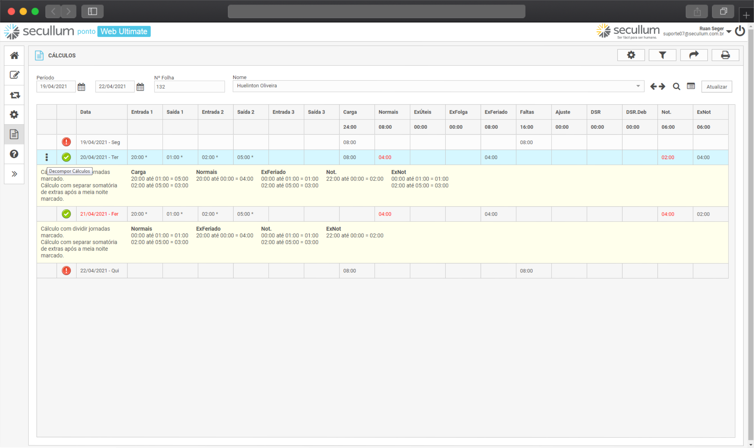 Dessa forma, o sistema irá dividir corretamente valores antes e após a meia noite, conforme imagem abaixo e explicação do Decompor Cálculos: