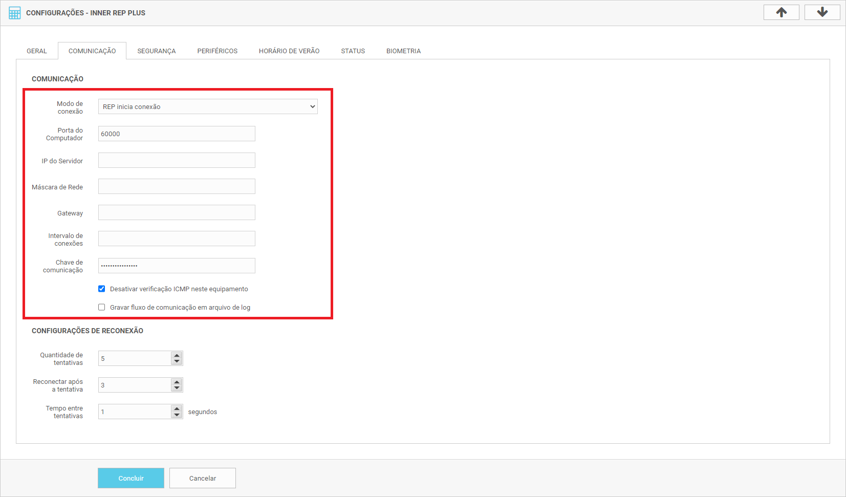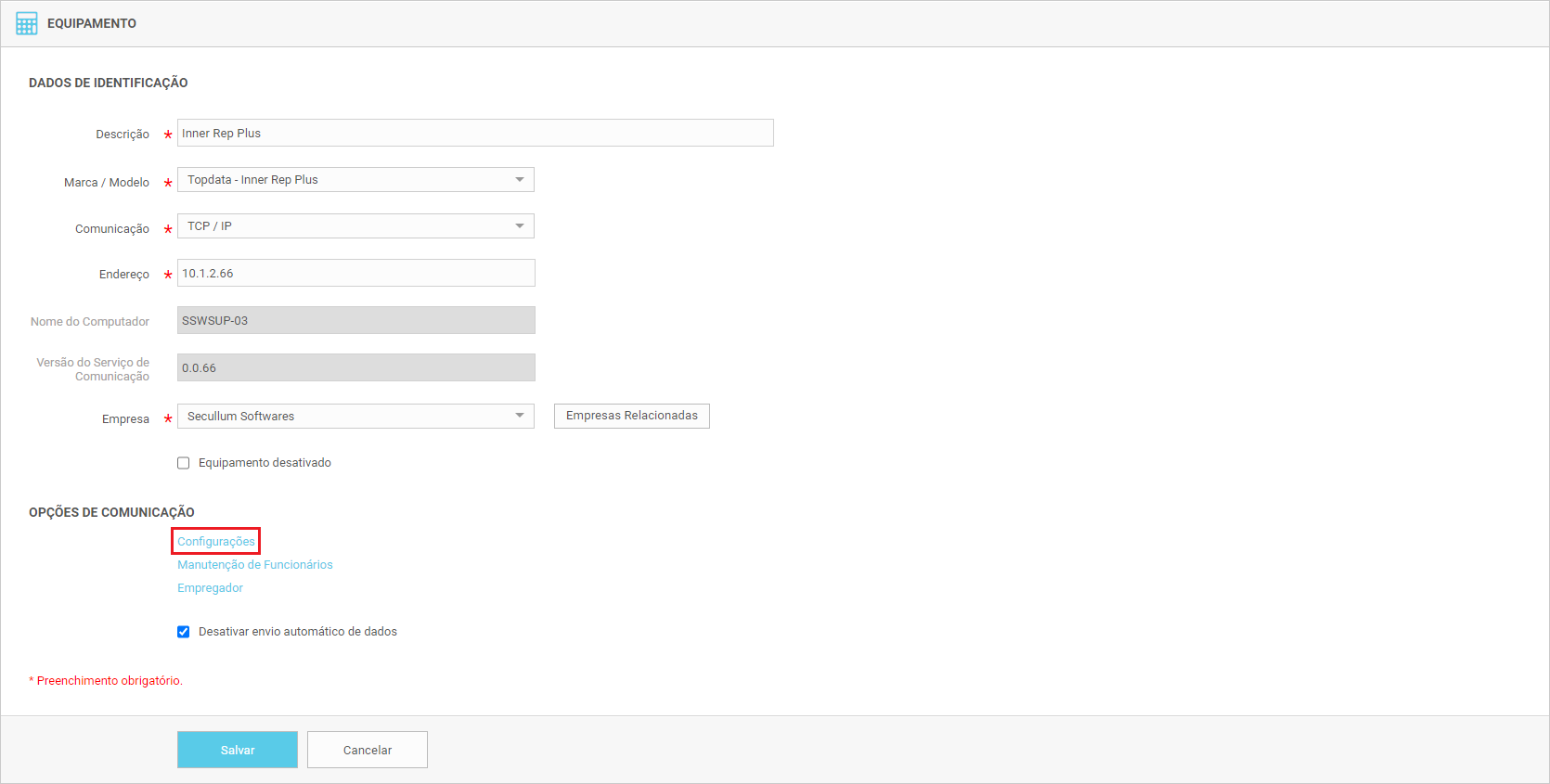 - IP do Computador: Endereço IP com qual o equipamento irá comunicar (o IP será fornecido pela Secullum após fazer a compra do Secullum Comunicador Servidor, caso utilize o mesmo);