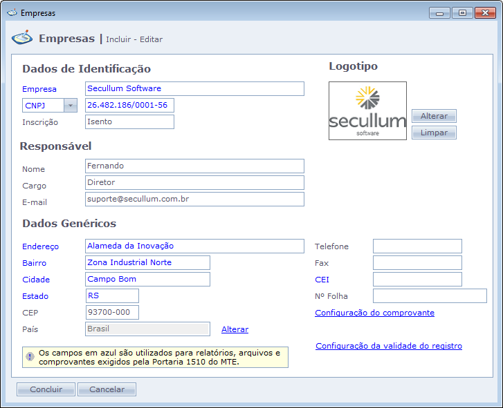 Os campos em azul são utilizados para relatórios, arquivos e comprovantes exigidos pela Portaria 1510 do MTE. Estes campos devem ser preenchidos.