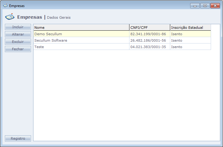 Nesta primeira tela, é listado todas as empresas que temos cadastrada no sistema. A empresa que aparece com o fundo amarelado nesta tela, é a empresa principal, que é utilizada para fins de registro.