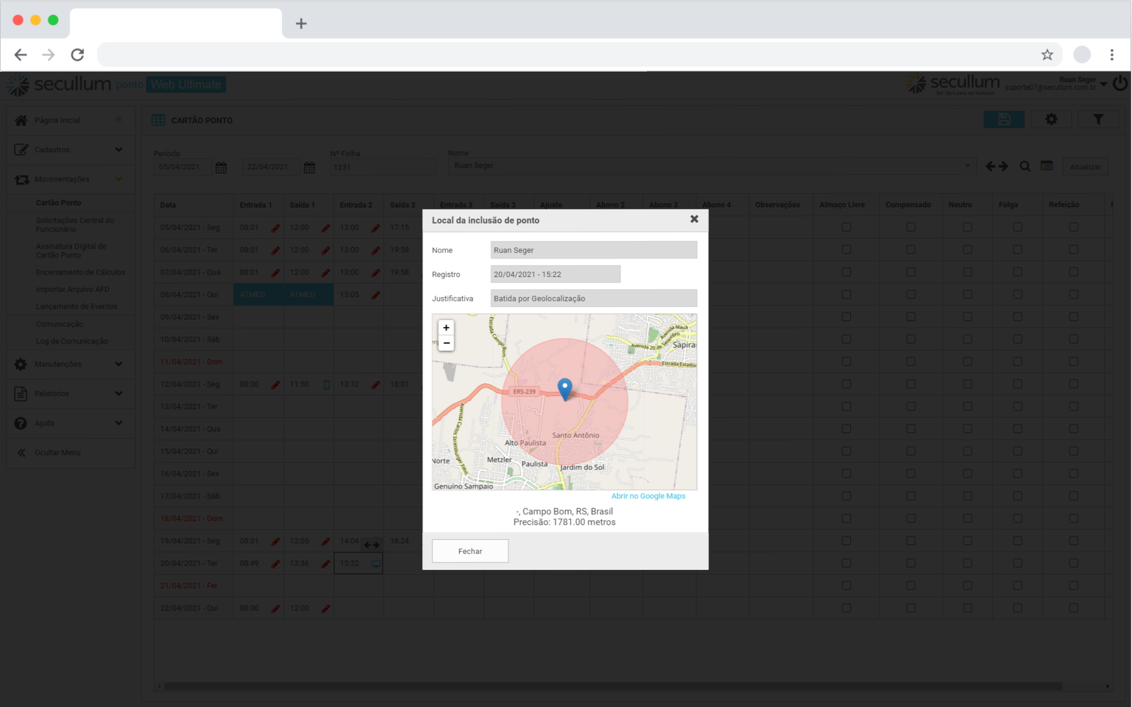 As batidas depois de realizadas podem ser vistas diretamente no navegador ou no aplicativo em Cartão Ponto, onde mostrará o mapa do Google Maps informando a localidade exata da marcação.