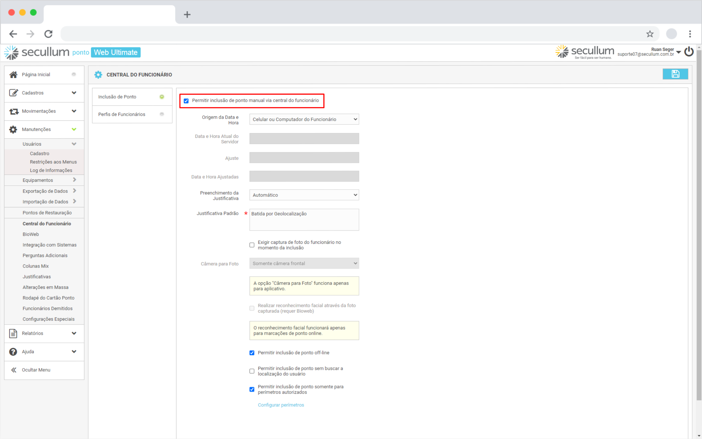 A opção Permitir inclusão de ponto manual via central do funcionário está disponível a partir da versão Basic do Secullum Ponto Web.