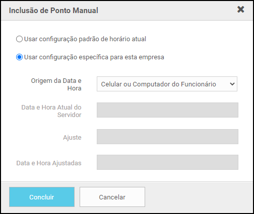 Entre em: Cadastros - Empresas - Selecione a empresa desejada - Clique em Inclusão de Ponto Manual - Nesta tela você poderá Usar configuração padrão de horário atual (Brasília) ou Usar configuração específica para esta empresa.