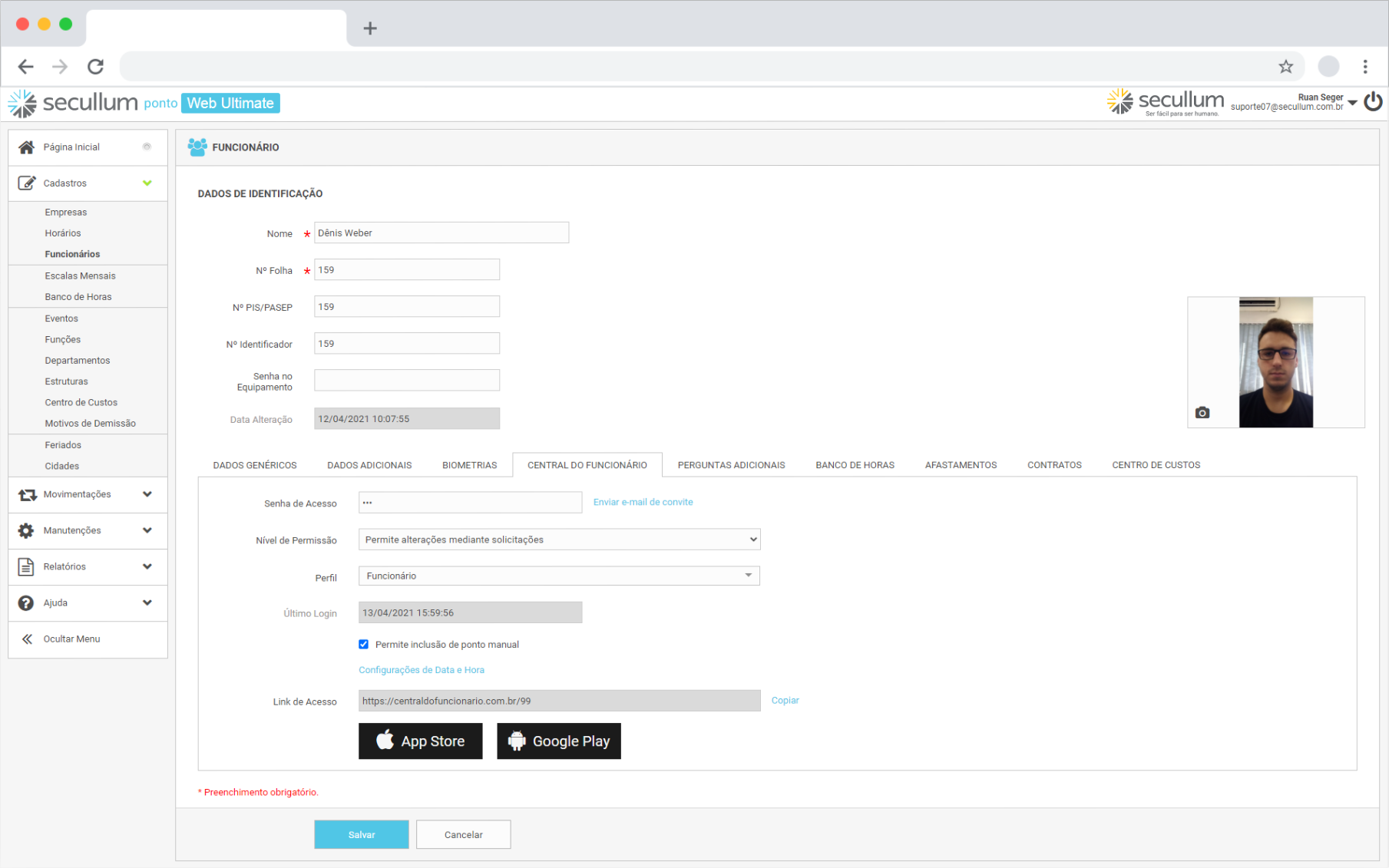 Para isso vá em: Cadastros - Funcionários - Selecione o funcionário desejado e vá na aba Central do Funcionário - Configure uma senha em Senha de Acesso e marque a opção Permite inclusão de ponto manual - Clique em Salvar em seguida.