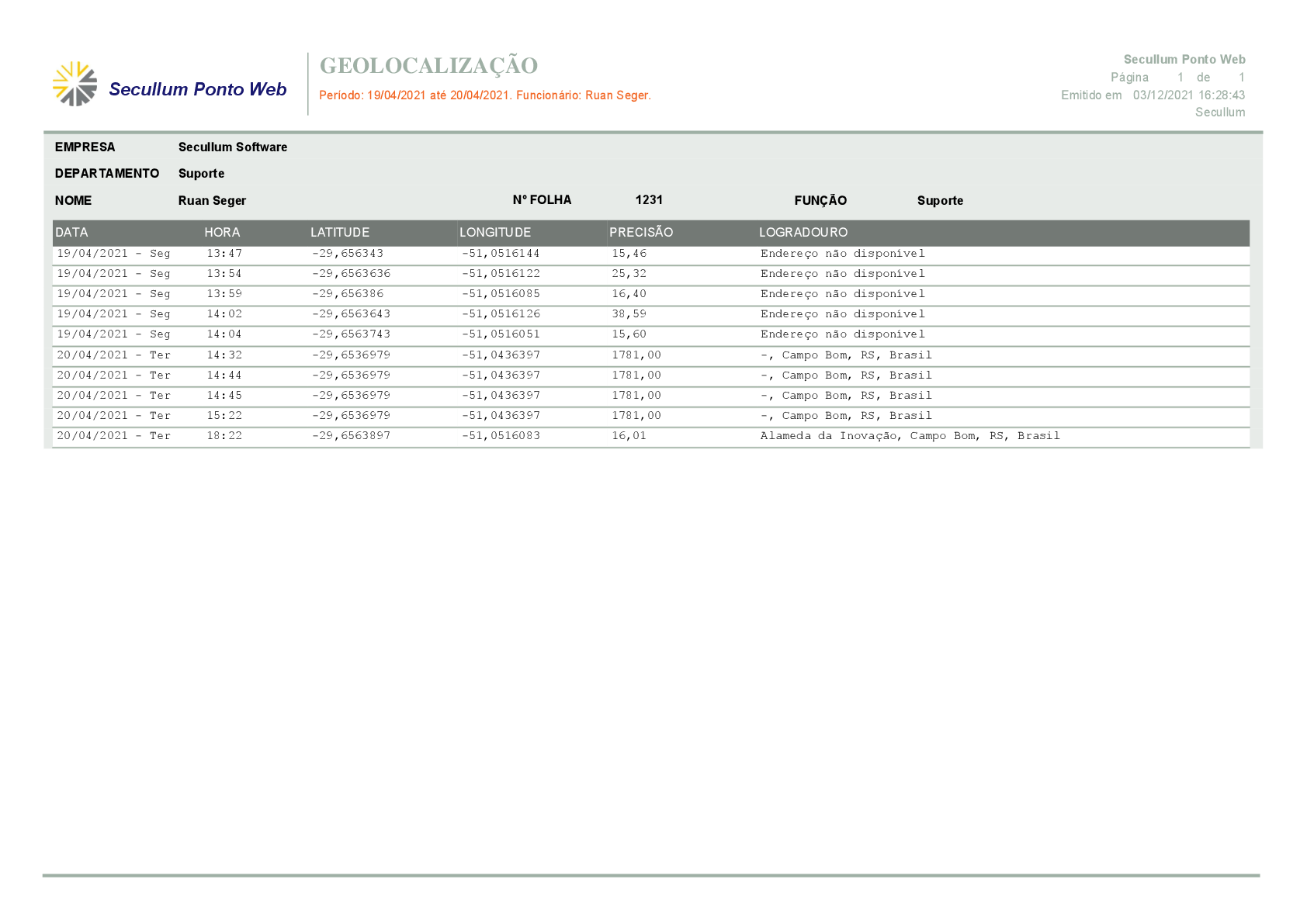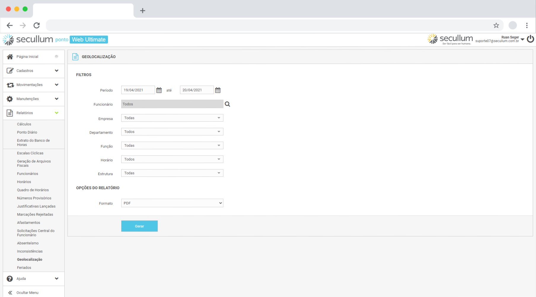Para tirar um relatório de geolocalização dos funcionários, vá até o caminho: Relatórios - Geolocalização: