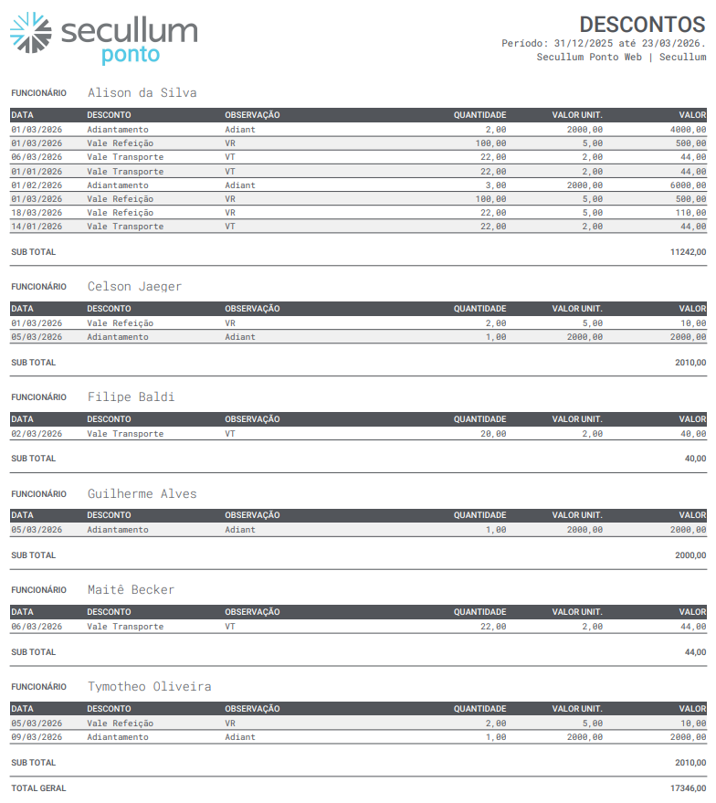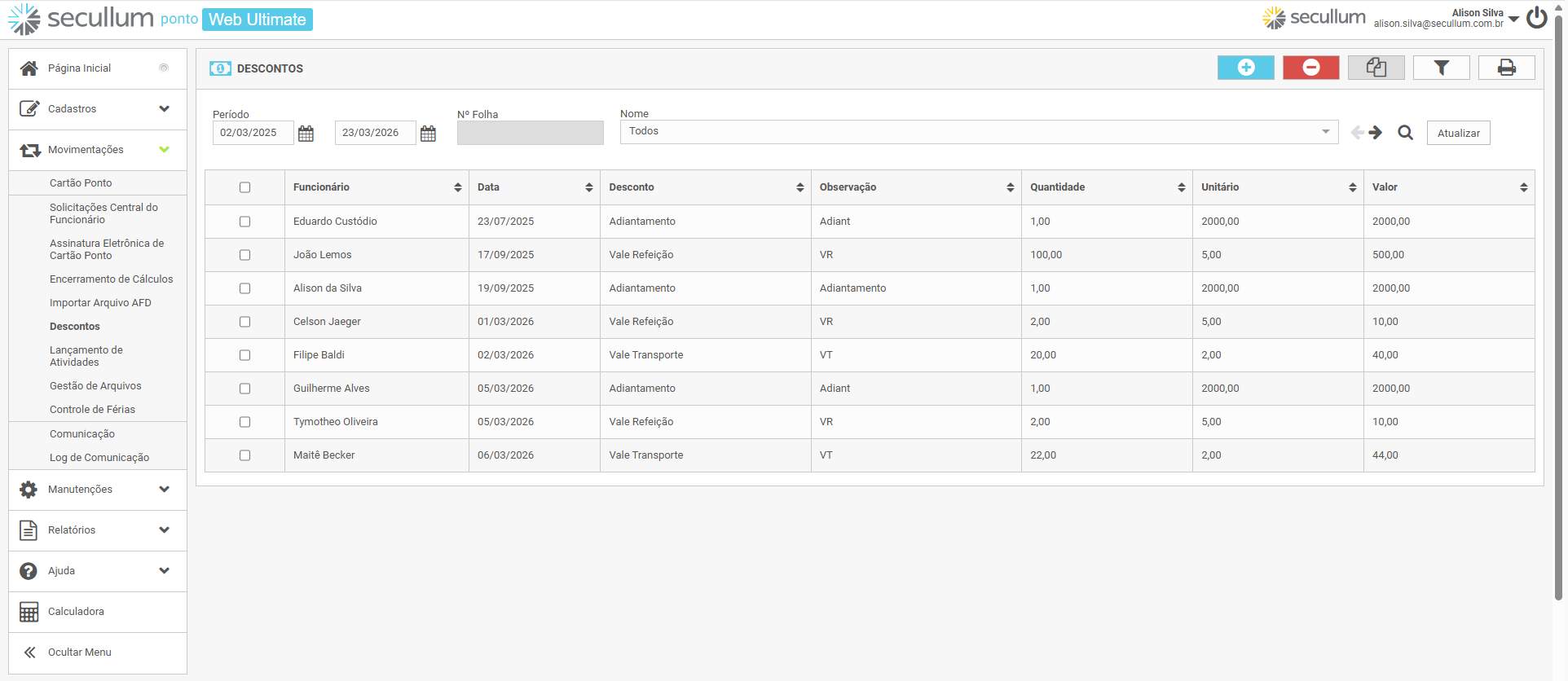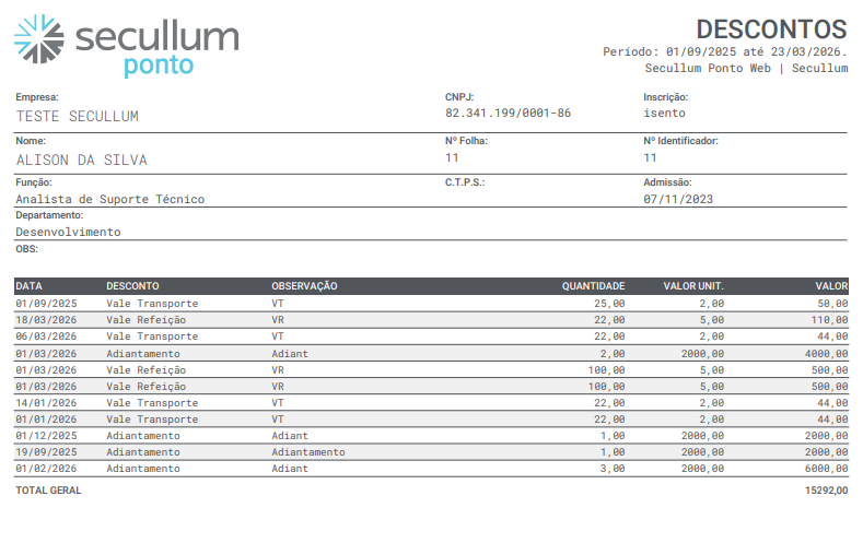 Dentro do Secullum Ponto Web podemos criar e realizar lançamentos de descontos para os funcionários, esses descontos podem ser: Vale Transporte, Vale Alimentação, Adiantamento Salarial, Contribuição do INSS, entre outras opções que serão mostradas no holerite dos funcionários.
