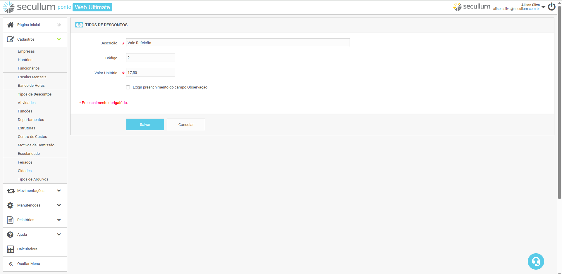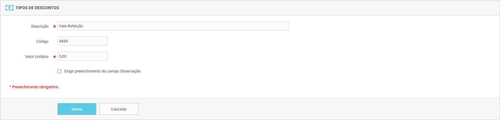 Descrição: Cadastre o nome do desconto, o mesmo usado na contabilidade, alguns exemplos: Vale Transporte, Adiantamento Salarial, Plano de Saúde, Cesta Básica, entre outros;