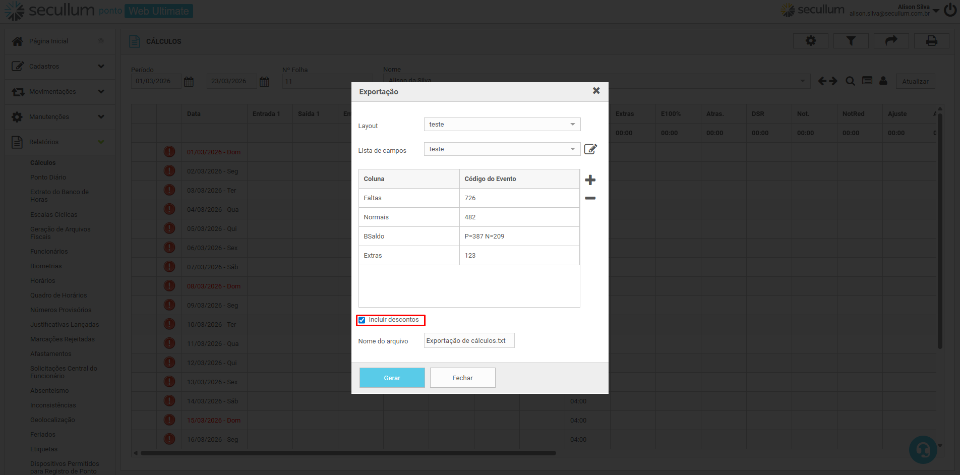 Para exportar esses descontos, entre no menu: Relatórios - Cálculos - Exportar - Selecione as colunas que deseja exportar e marque a opção Incluir descontos lançados - Selecione um nome para o arquivo - Clique em Gerar:
