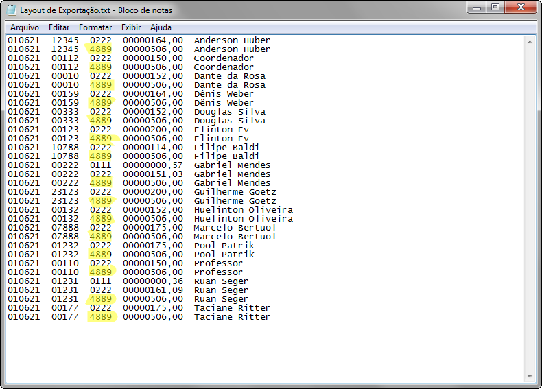 Ao abrir o arquivo, devemos procurar pelo código configurado do Desconto que foi lançado neste período exportado, no nosso caso de exemplo, o desconto Vale Refeição foi configurado com o Código 4889, como podemos ver abaixo:
